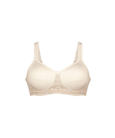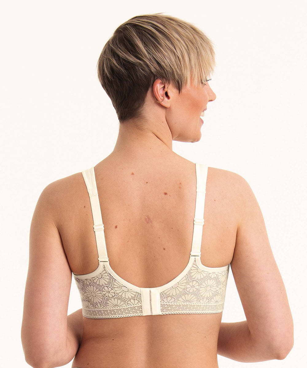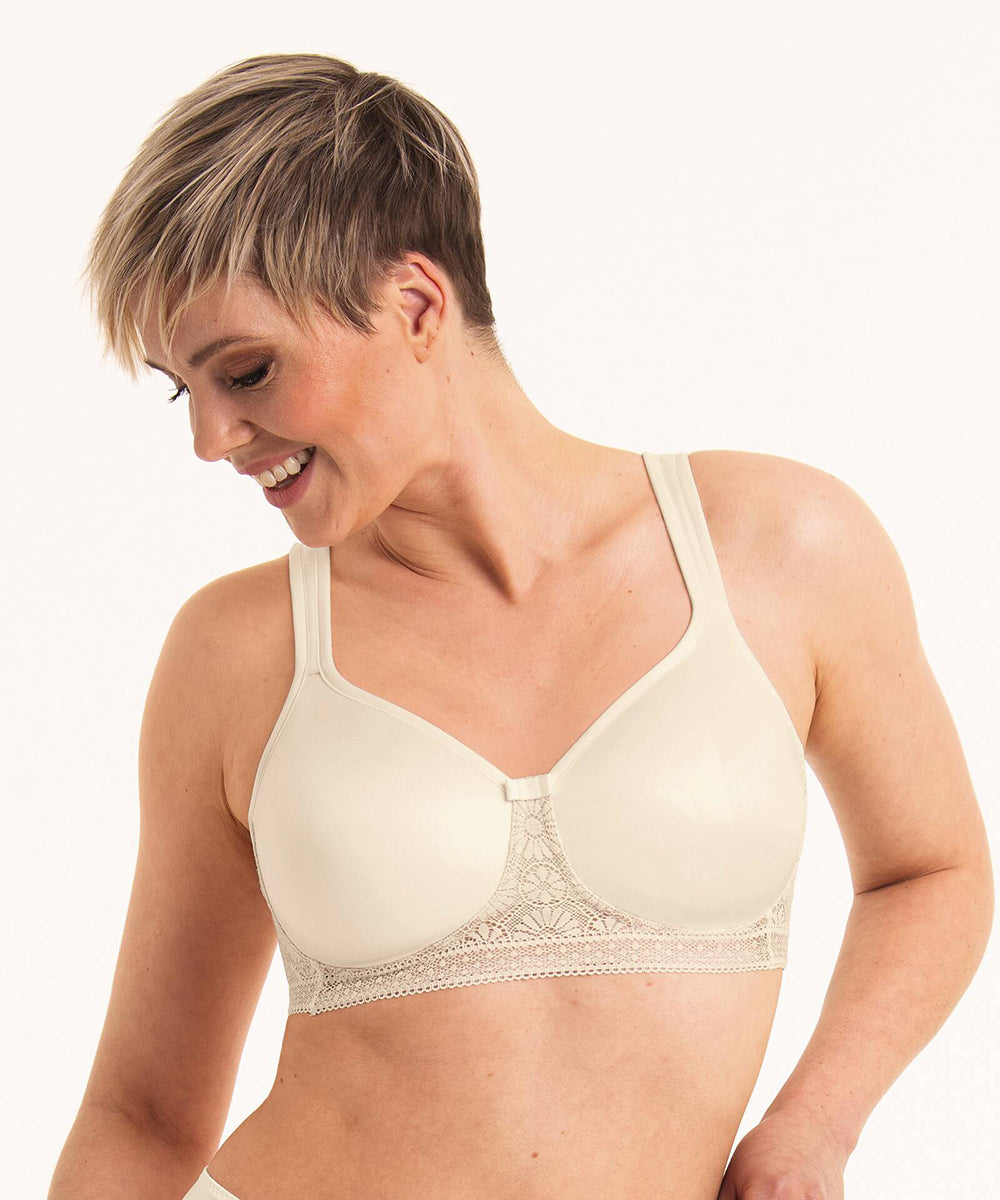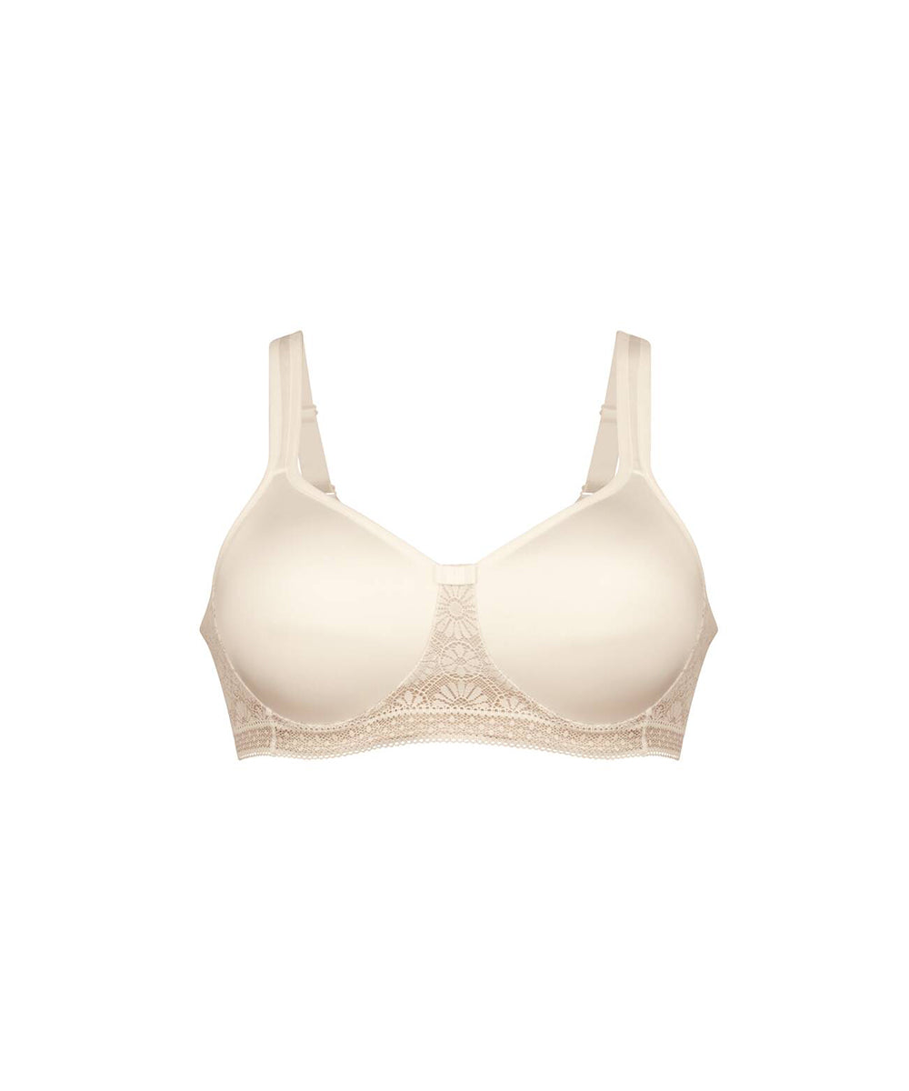 T-shirt bh'en fra Anita er speciel designet til kvinder efter brystoperation, der ønsker både komfort og smuk pasform. De sømløse, silkebløde skåle med let skum giver en glat silhuet og diskret dækning under tøjet. Den fine margueritblonde foran og på ryggen tilfører et romantisk og feminint udtryk. Bh’en er lavet i et stærkt, men blødt clean-cut materiale, der giver sikker støtte – helt uden behov for en klassisk underbånd. De brede, blødt polstrede komfortstropper sikrer ekstra behagelig bærekomfort hele dagen.