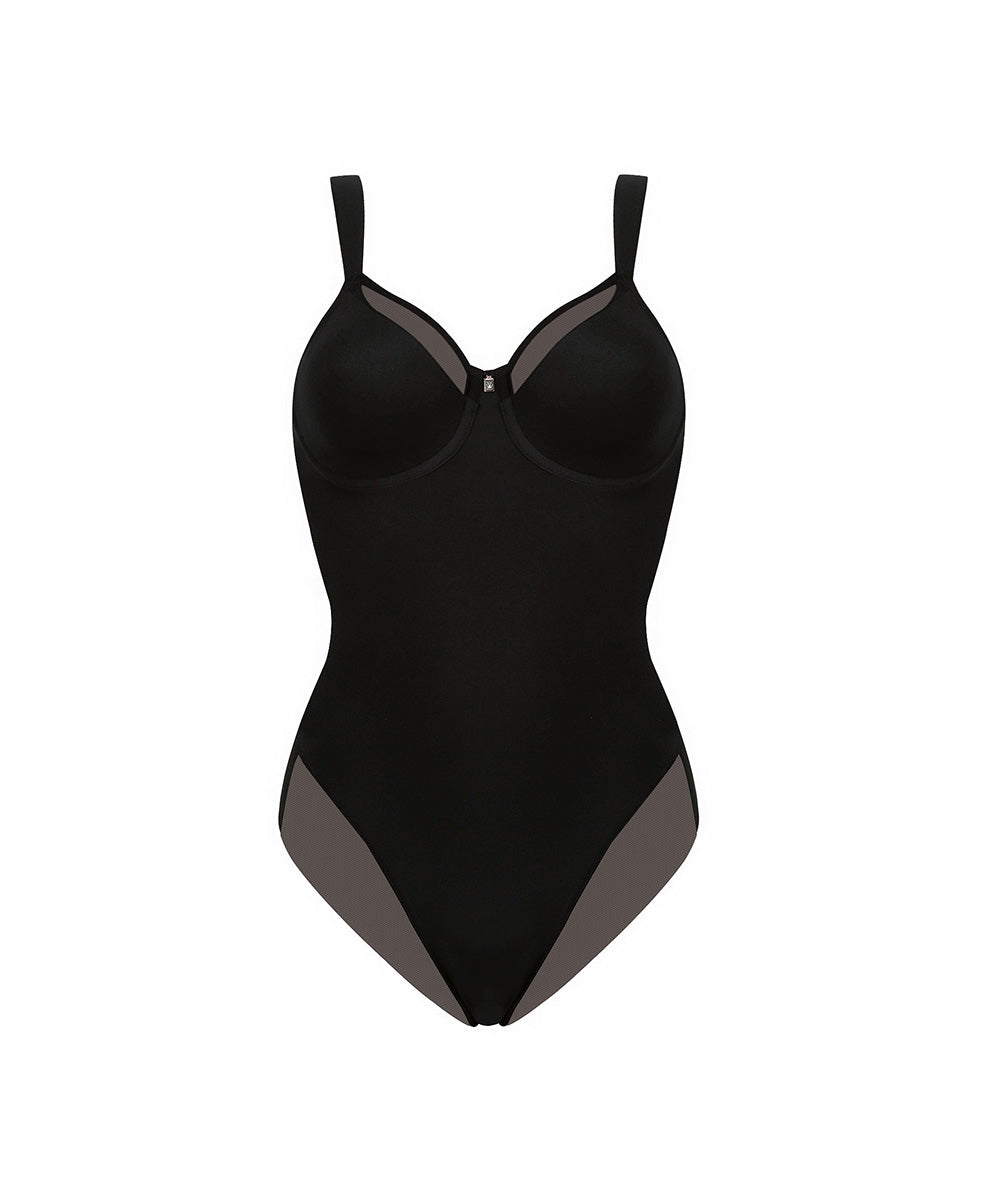 Enkel body med formstøbte skåle med bøjle, men uden vattering. Komfortabel model med brede stropper og nikkelfri, polstret hægtelukning i skridtet. Body'en er designet i et innovativt materiale, som er formfast og fleksibelt. Body'en giver shape effekt til mave og talje. Materiale: 56% polyamid, 32% elastan, 12% polyester.