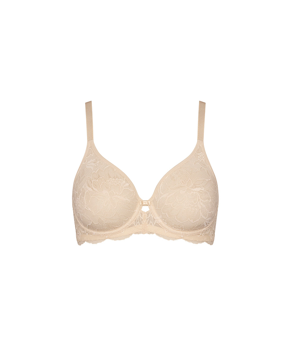 Feminin trekvartskålsbh dekoreret med fine blonder. Bh'ens bagstykke er lavet i glat lycrajersey, der tilpasser og følger kroppens bevægelser.