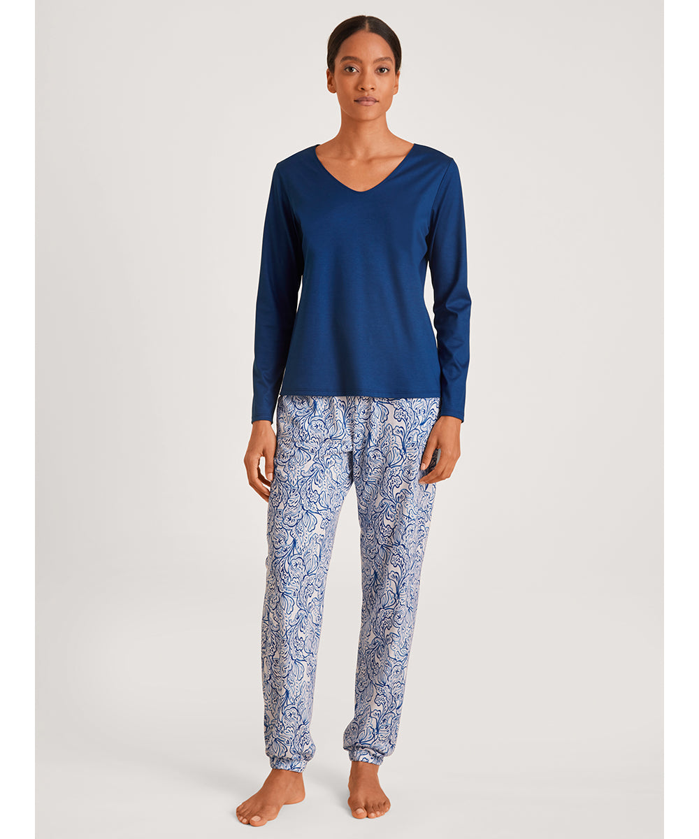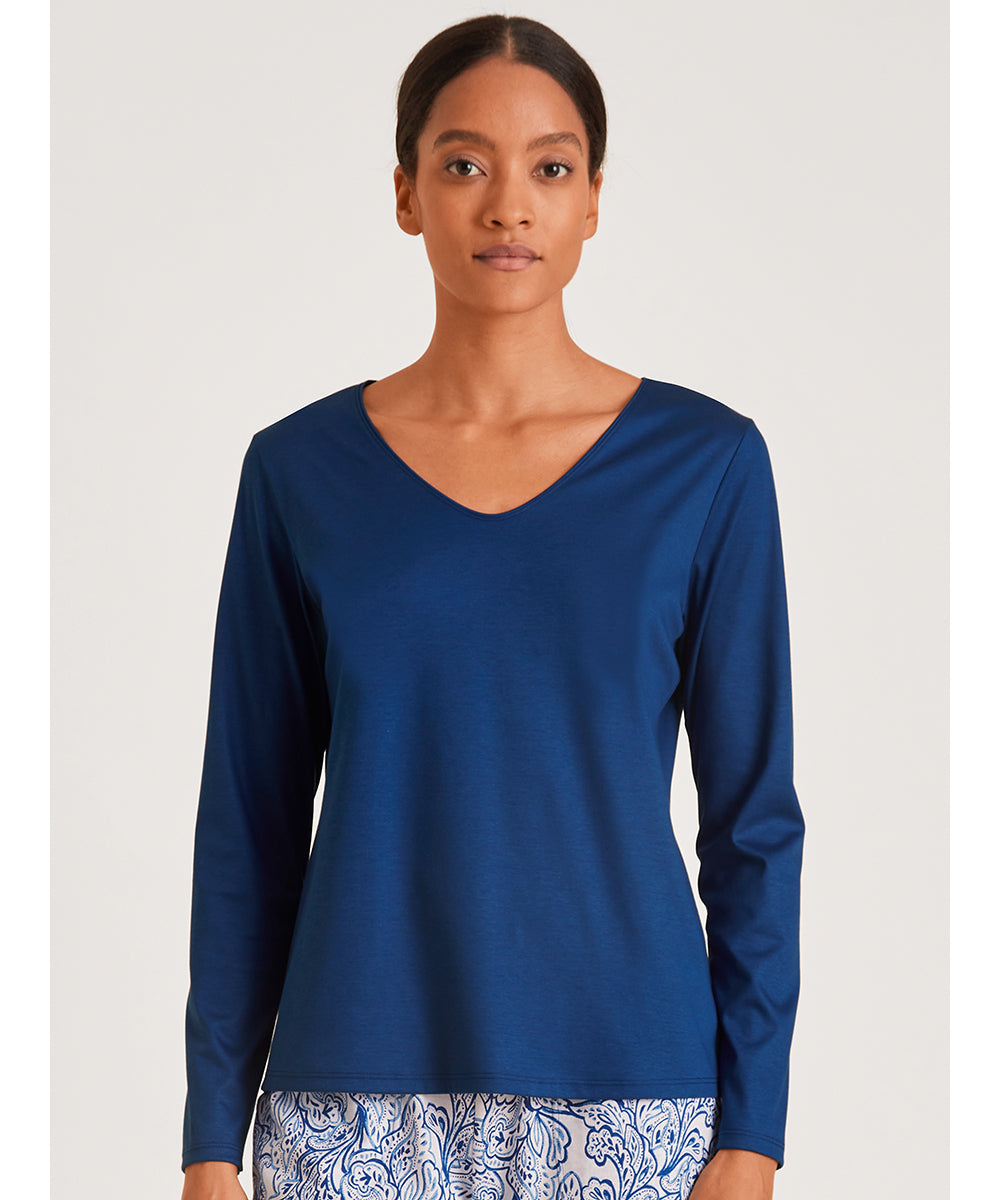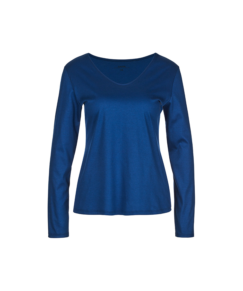 Feminin bluse fra Calida med v-hals og en løs pasform. T-shirten er lavet i en blød bomuld. Mix t-shirten med din ynglings natbuks fra Calida. Vær obs på størrelsesguide.