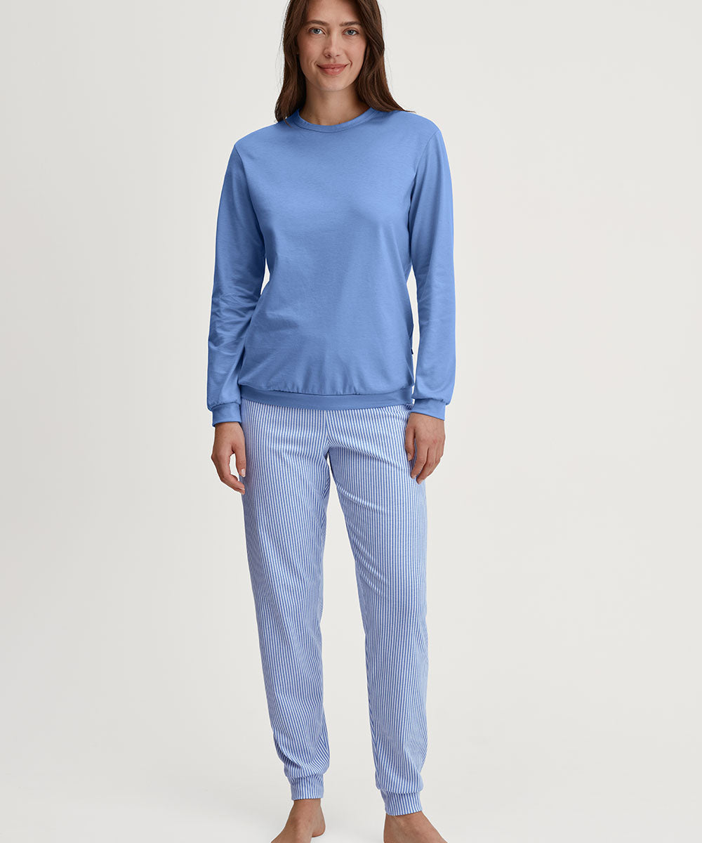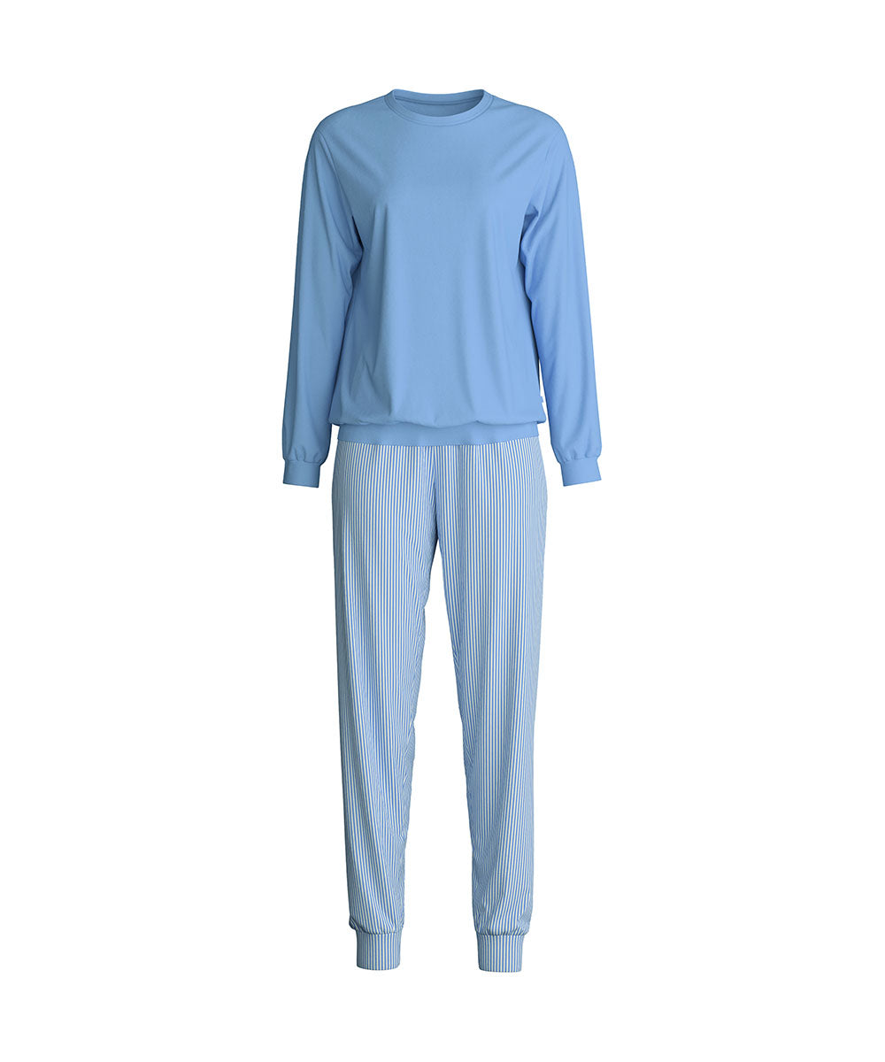 Elegant nattøjssæt fra Calida med lange ærmer og ben. Nattøjssættet er designet med bukser i et fint print med tilhørende ensfarvet bluse. Både bluse og bukser har manchetter i ved hænder og fødder. Vær obs på størrelsesguide.