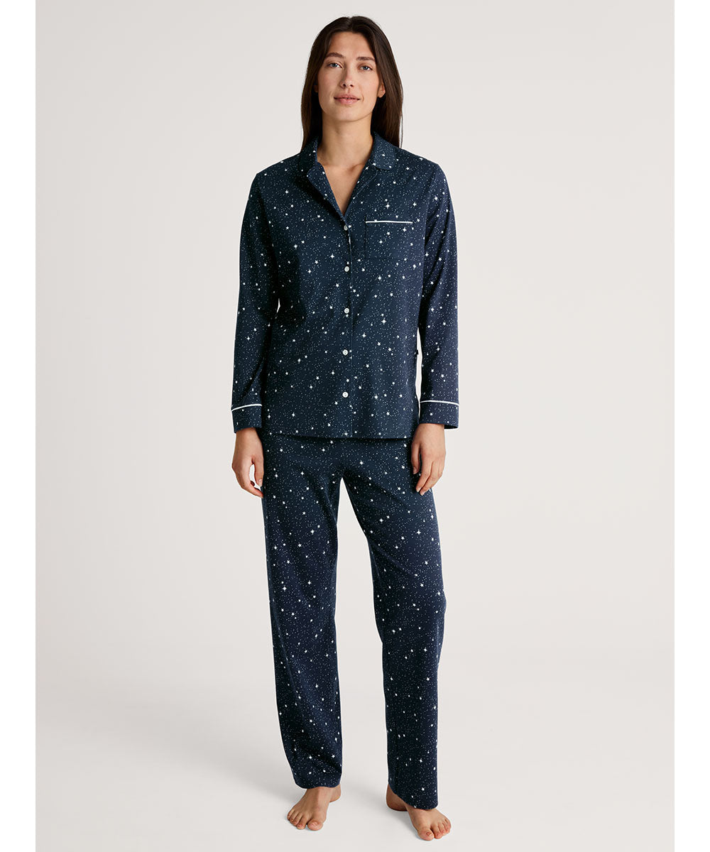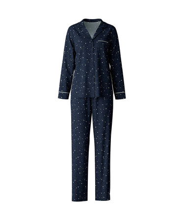 Skønt pyjamassæt fra Calida med lange ærmer og ben. Nattøjssættet er designet i et fint print, og med en lille lomme på brystet. Pyjamasskjorten har opknapning hele vejen ned. Vær obs. på størrelsesguide.