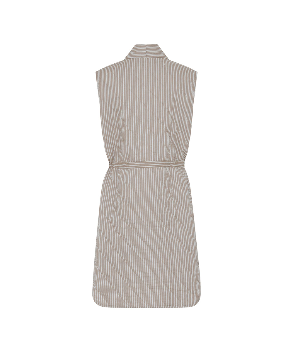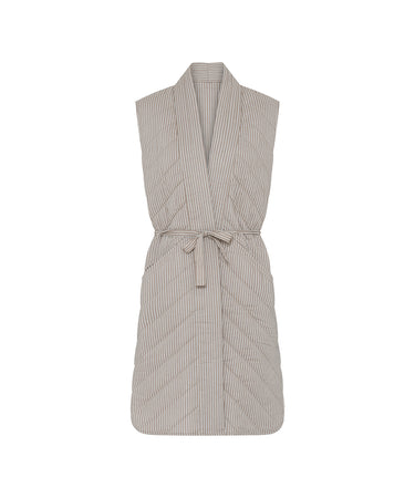 Quilted vest fra CCDK Copenhagen. Vesten er lang og er designet med striber og bindebånd i taljen.
