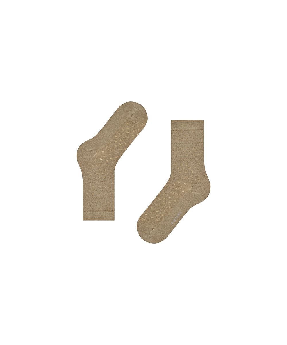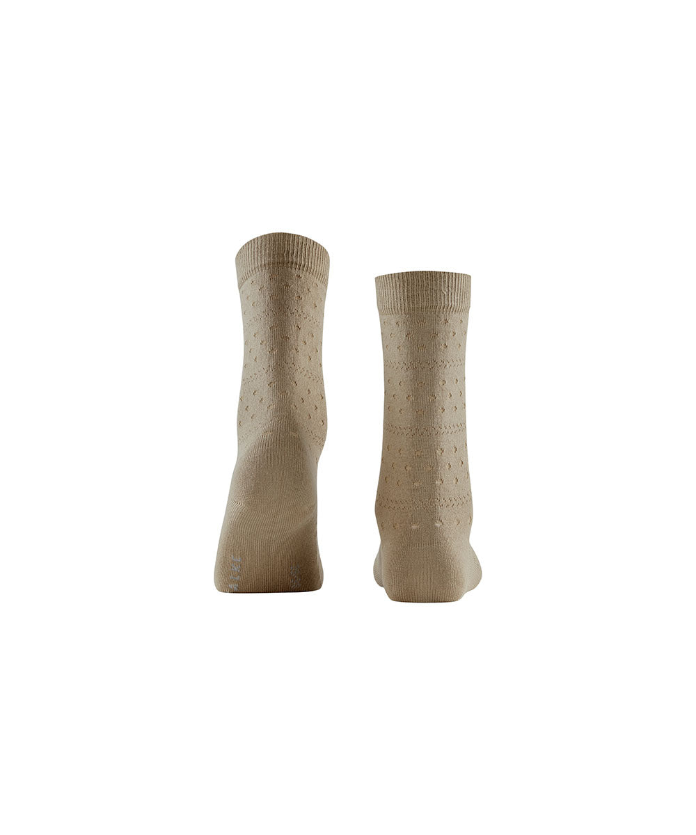Disse stilfulde sokker giver det klassiske prikkede mønster et moderne og feminint udtryk. Det semi-transparente design skaber en let og raffineret kontrast, hvor de tone-i-tone prikker fremhæves på elegant vis. Den høje andel af blød og bæredygtig FALKE – WE CARE – COTTON gør sokkerne ekstra åndbare, mens en lille mængde genanvendte funktionelle garner sikrer elasticitet og holdbarhed. Afsluttes med FALKE Perfect Fit for maksimal komfort. Materiale: 91% bomuld, 8% polyamid, 1% elastan