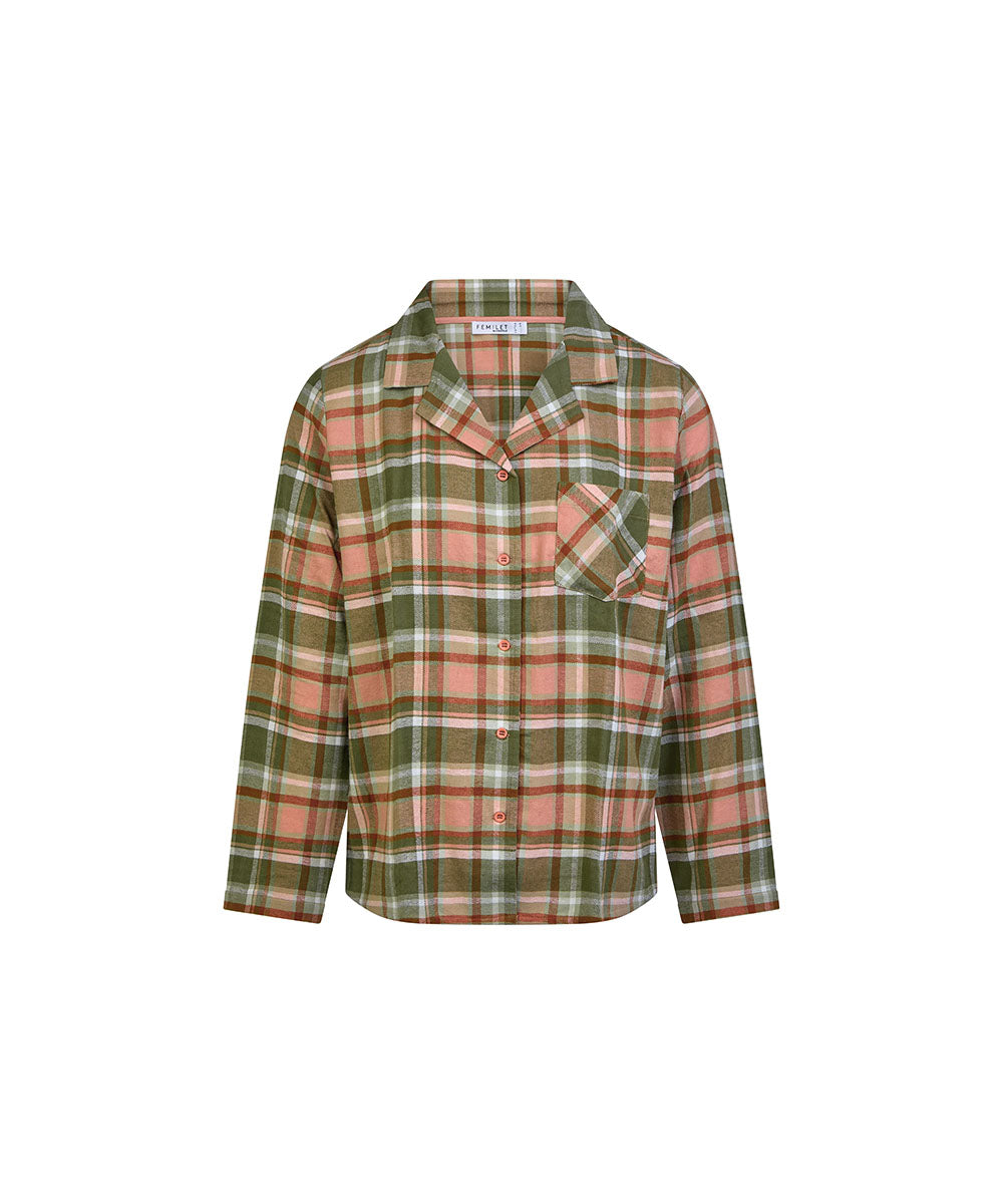 Klassisk pyjamas-skjorte fra Femilet med et ternet mønster i blød bomuldsflonel. Skjorten har v-hals, lange ærmer og en række knapper der gør det muligt at åbne den helt op.