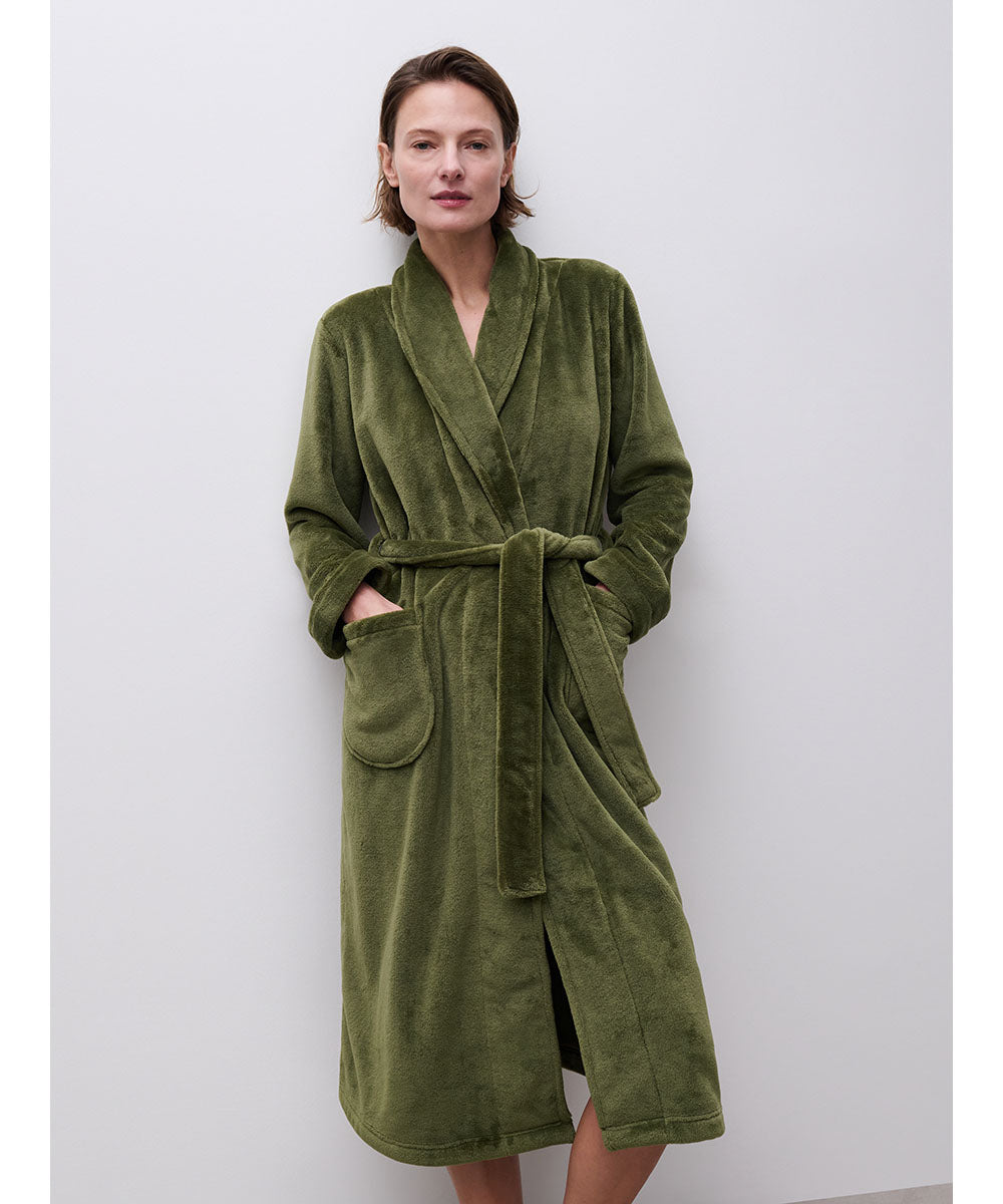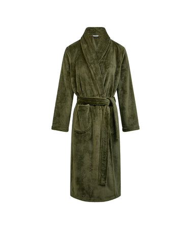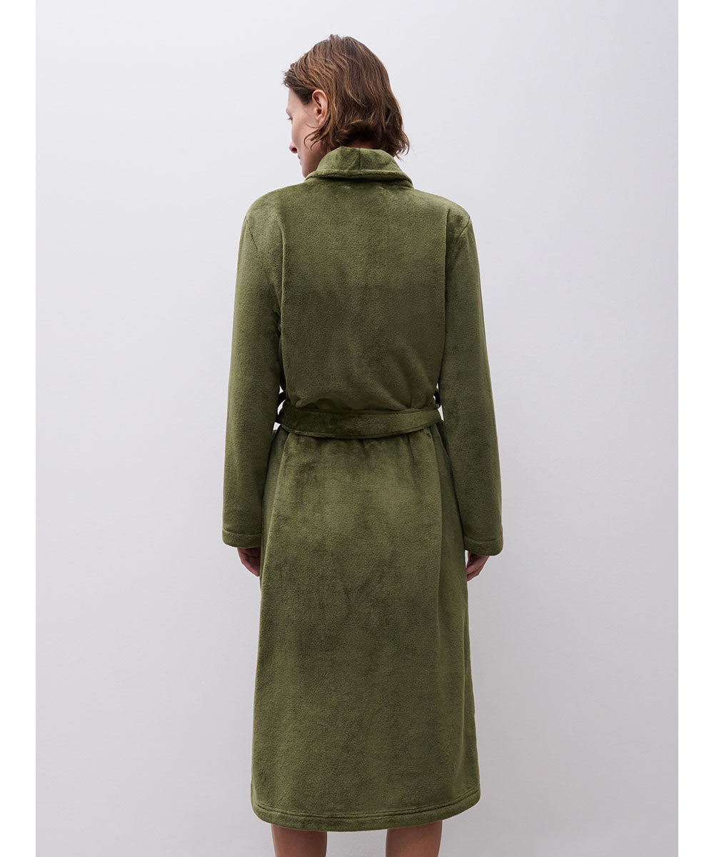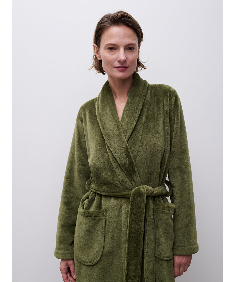 Behagelig og lang kåbe fra Femilet, der lukkes med et bælte i taljen.