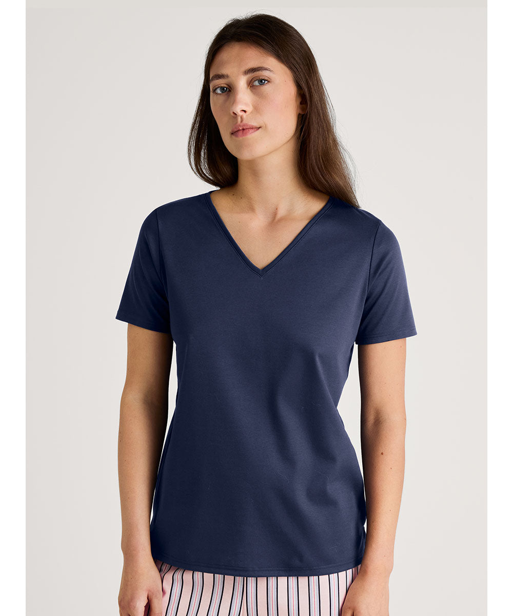 Feminin t-shirt fra Calida med korte ærmer og en løs pasform. T-shirten er lavet i lækker, blød og åndbar bomuld. Vær obs. på størrelsesguide.