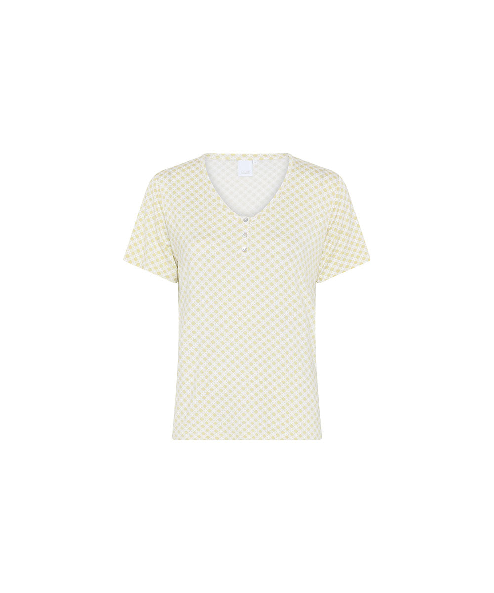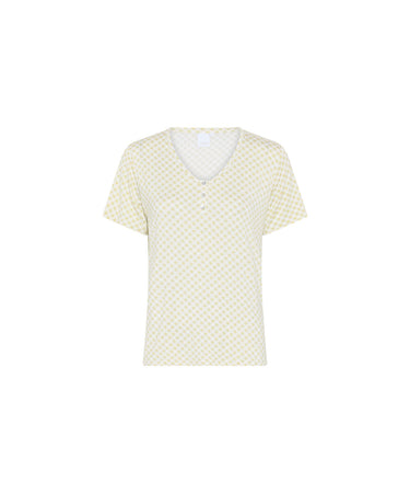 Kortærmet T-shirt fra CCDK Copenhagen. T-shirten har små knapper, og er designet i et yndigt print. Blusen er lavet i en virkelig blød Ecovero viskose-kvalitet.
