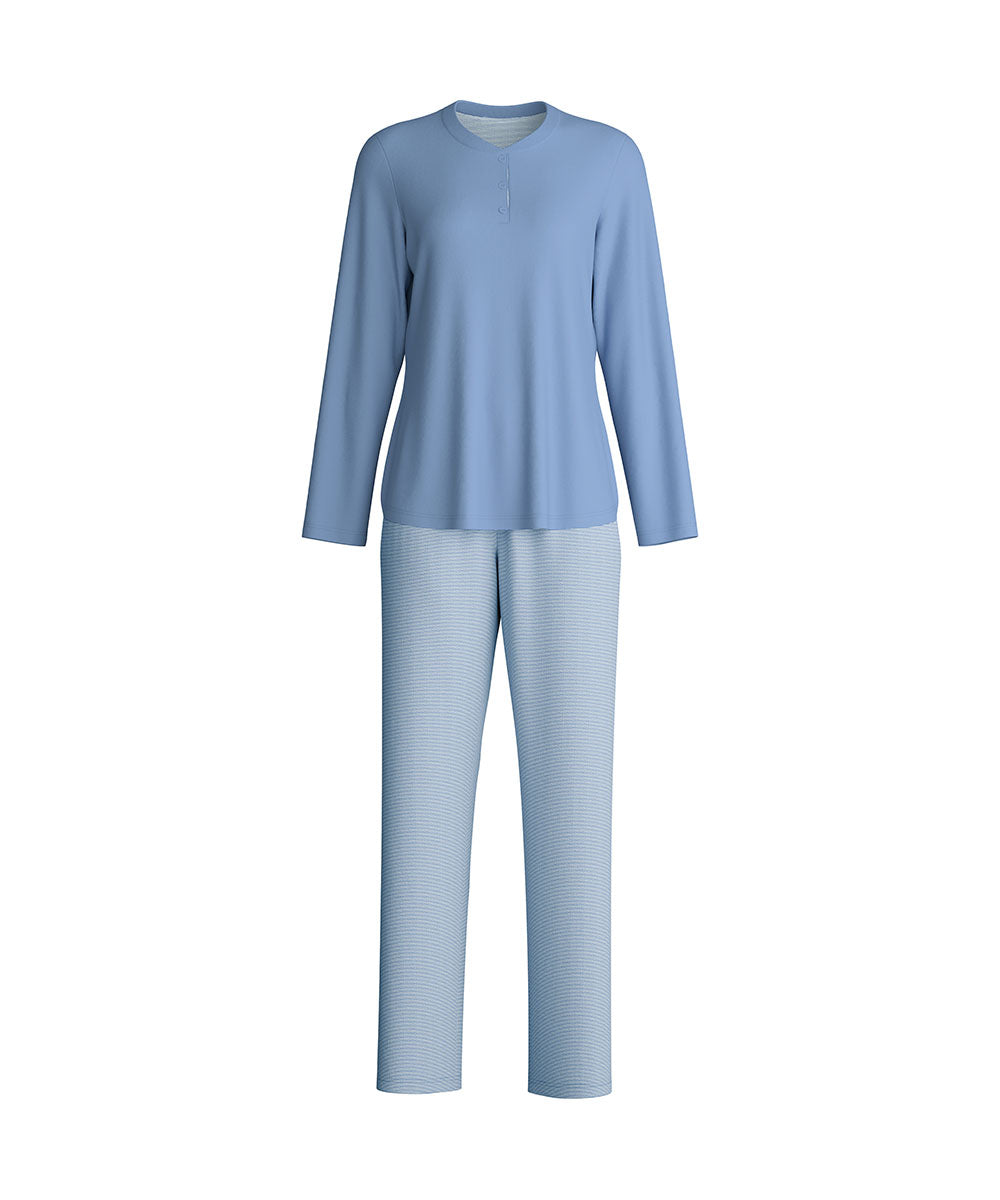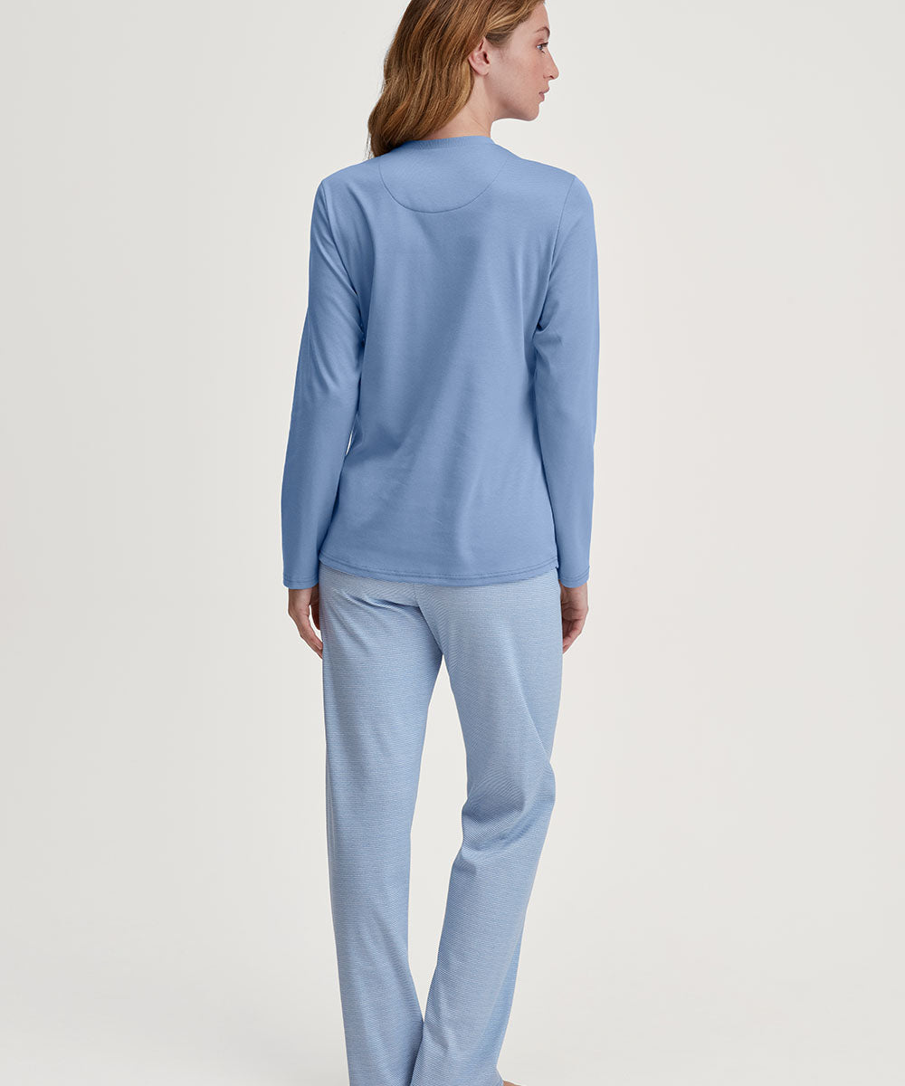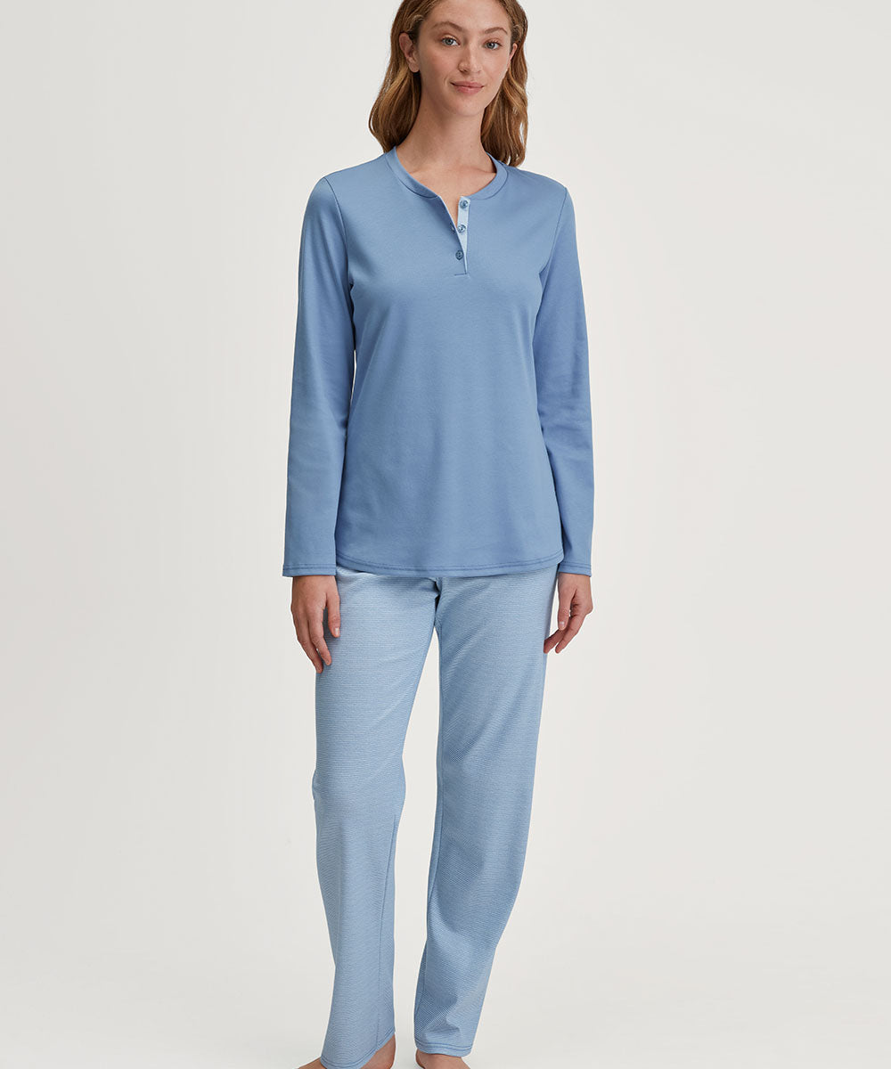 Elegant nattøjssæt fra Calida med lange ærmer og ben. Nattøjssættet er designet med bukser med diskrete striber med tilhørende ensfarvet bluse. Vær obs på størrelsesguide.