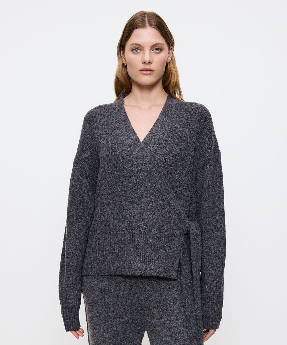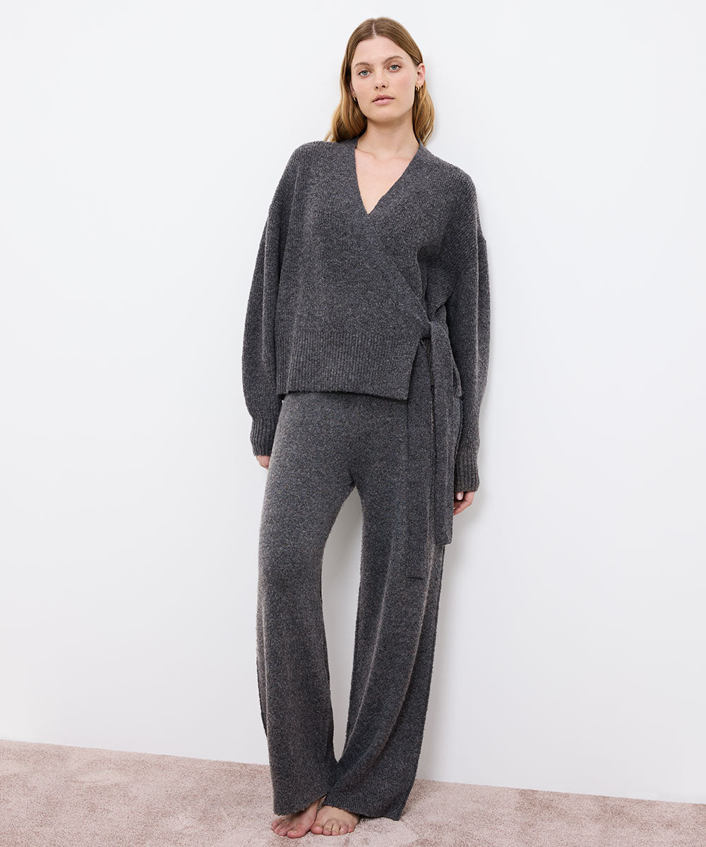 Slå-om cardigan fra Triumph. Kimonoen er lavet i uld, hvilket gør den behagelig og blød, samtidigt med at det åndbare materiale holder på varmen. Style kimonoen som et lækkert sæt med de matchende bukser i samme serie.