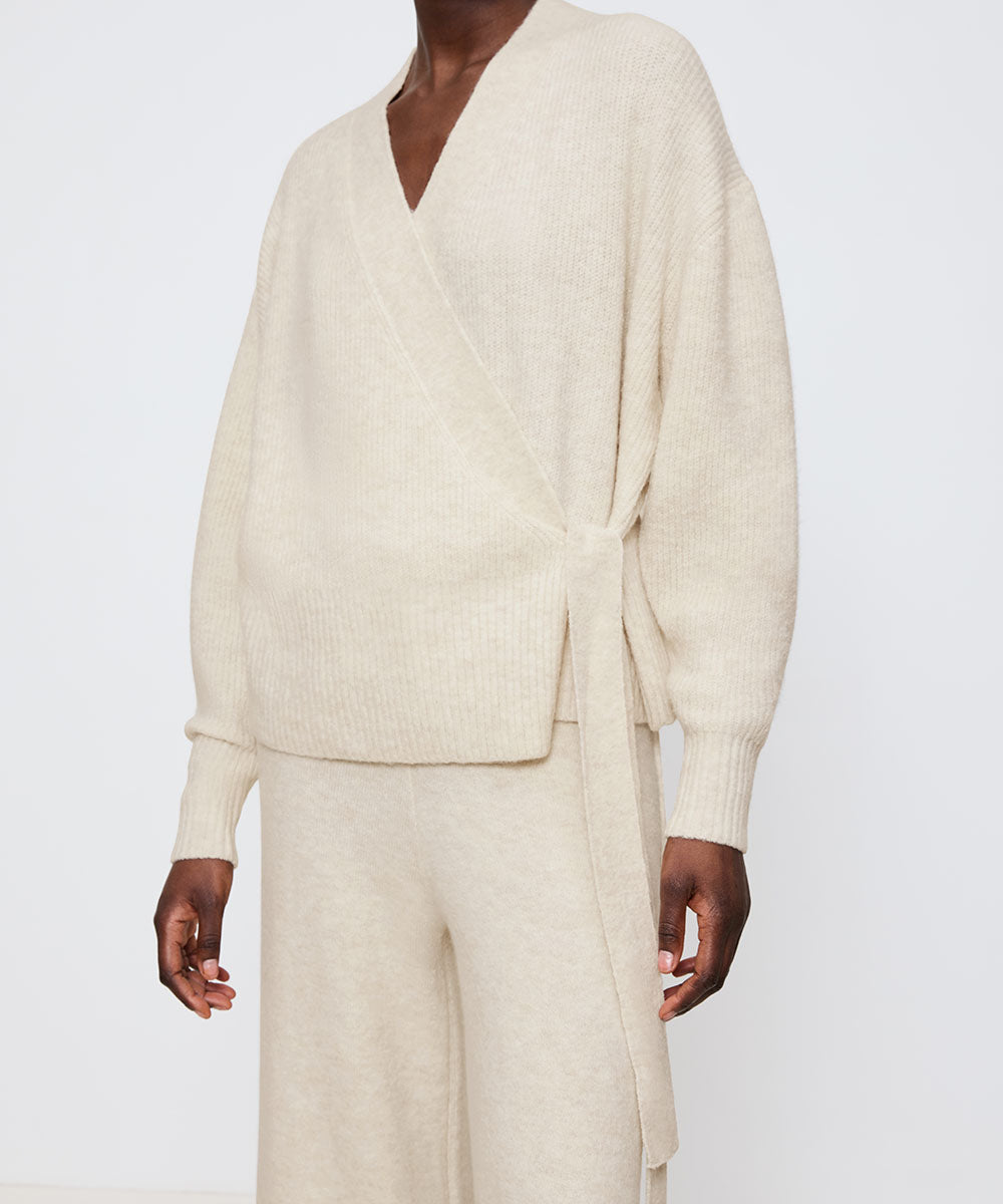 Slå-om cardigan fra Triumph. Kimonoen er lavet i uld, hvilket gør den behagelig og blød, samtidigt med at det åndbare materiale holder på varmen. Style kimonoen som et lækkert sæt med de matchende bukser i samme serie.