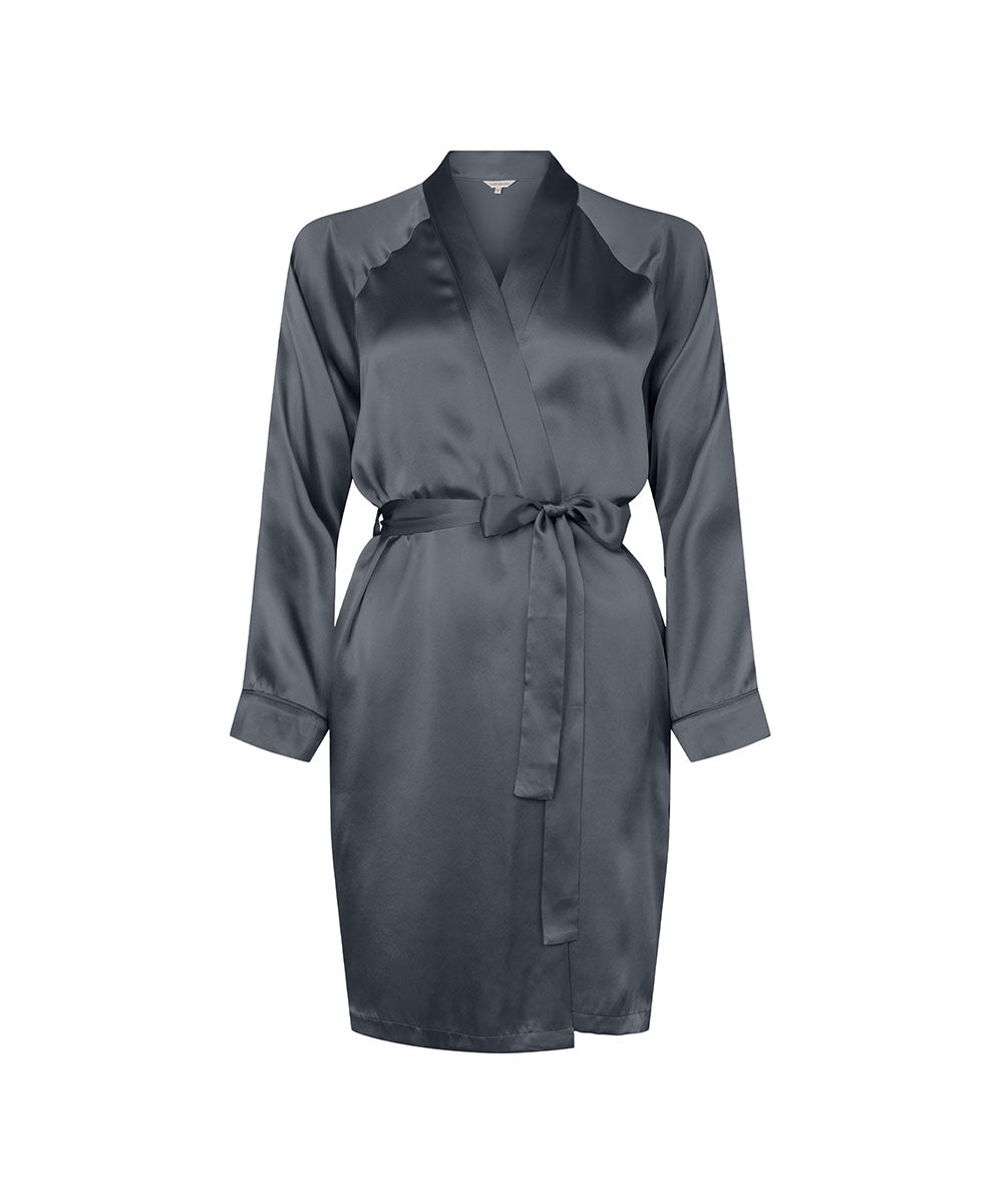 Elegant kort silkekimono fra Lady Avenue, der lukkes med bindebånd i taljen. Kåben er lavet i 100% vævet silke / silkesatin. Brug kimonoen over dit ynglings lingeri eller nattøj. Kimonoen i silke satin føles faktisk lige så godt som den ser ud. Silke er temperatur-regulerende, hvilket betyder at silke varmer på kolde dage og køler på varme dage. Så du kan med fordel købe nattøj eller homewear i naturlig silke, da du kan iføre dig det året rundt.