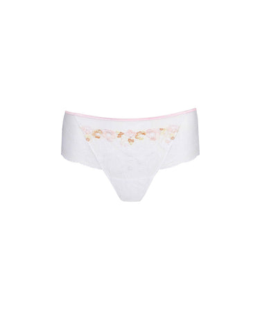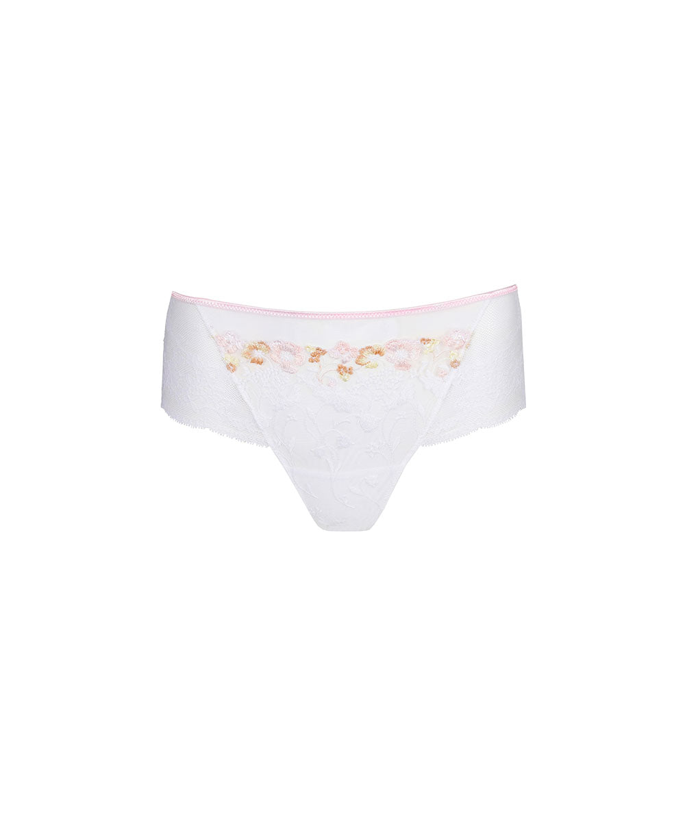 Yndig hipstertrusse fra Marie Jo, som er lavet med brede sidestykker. Hipstertrusse med fine blonsterdetaljer og flotte farver. Trussen er designet med fine blonder. Trussemodellerne hipster og shorts har en vandret benudskæring. Hipstertrussen går lidt op på balden og tegner et vandret snit mens shortsene dækker hele balden.
