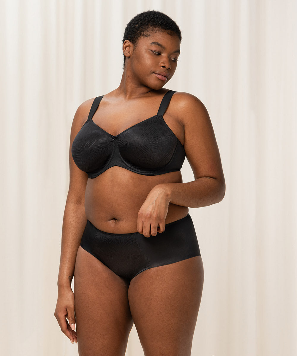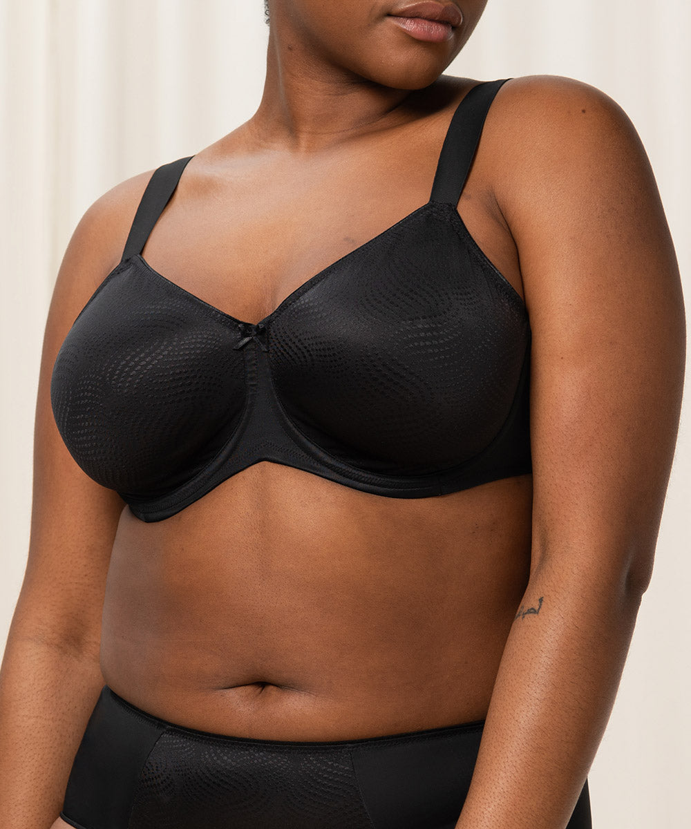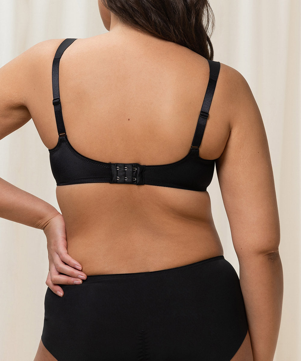 Komfortabel fuldskålsbh med minimizer effekt. Bh'en reducerer optisk barmen med en skålstørrelse. Bh'en har behagelig, brede stropper og giver optimalt hold og komfort til barmen. Enkel fuldskålsbh lavet i en glansfuld og blød kvalitet, som er dekoreret med yndige blonder. Lukkes med nikkelfri hægte.