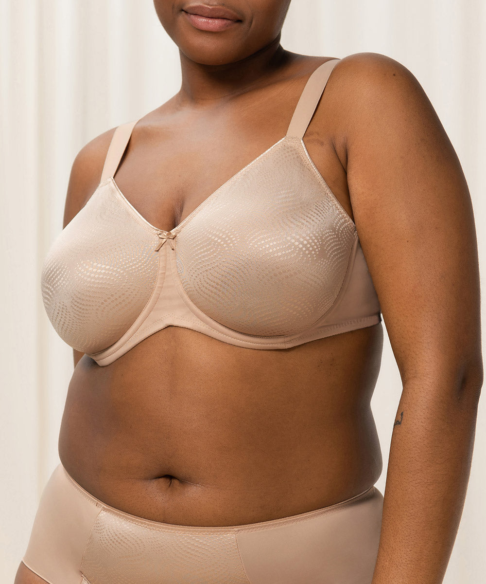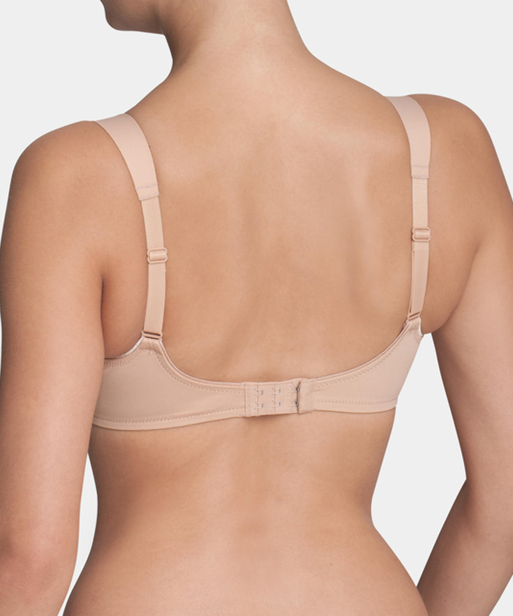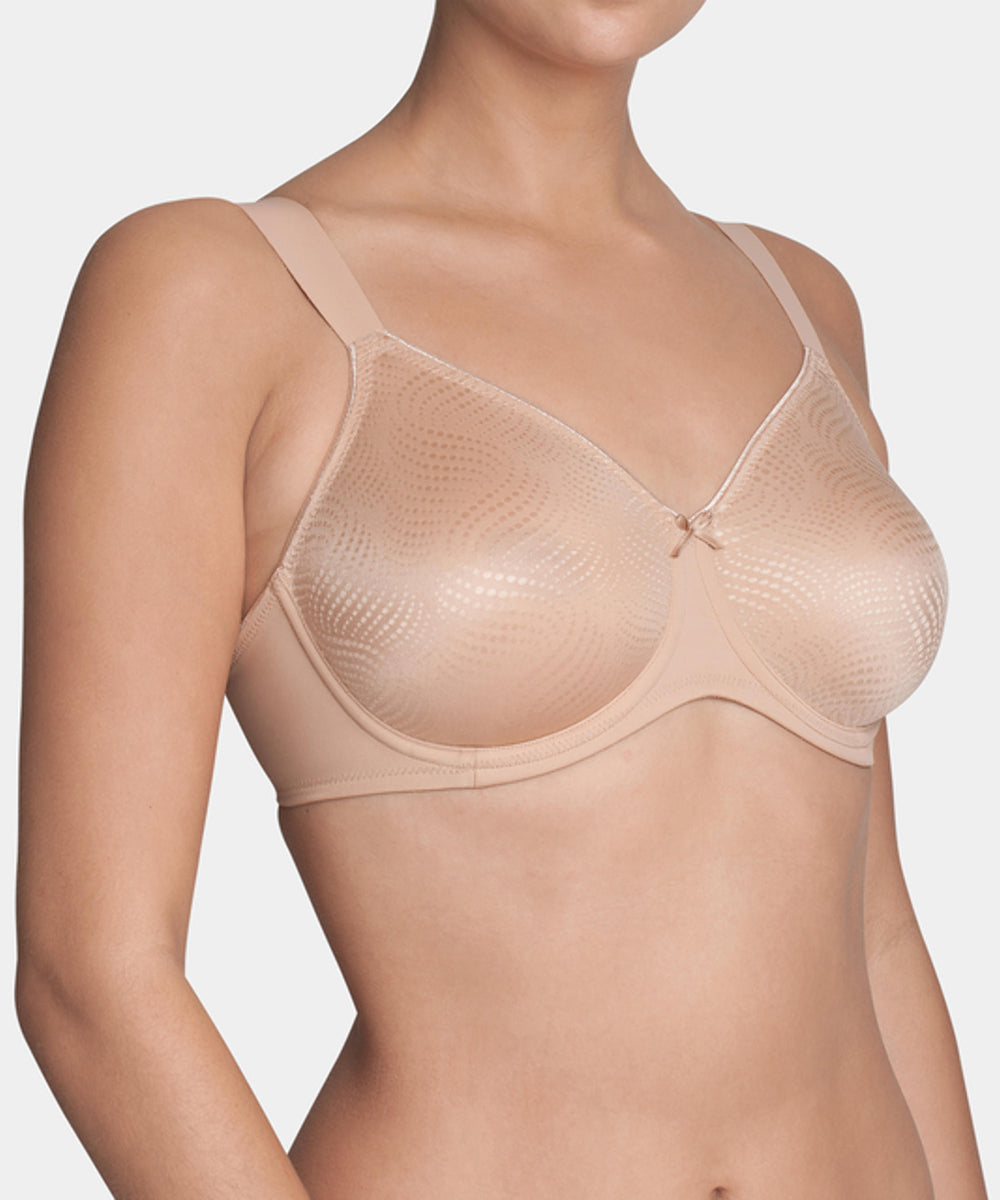 Komfortabel fuldskålsbh med minimizer effekt. Bh'en reducerer optisk barmen med en skålstørrelse. Bh'en har behagelig, brede stropper og giver optimalt hold og komfort til barmen. Enkel fuldskålsbh lavet i en glansfuld og blød kvalitet, som er dekoreret med yndige blonder. Lukkes med nikkelfri hægte.