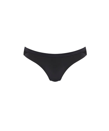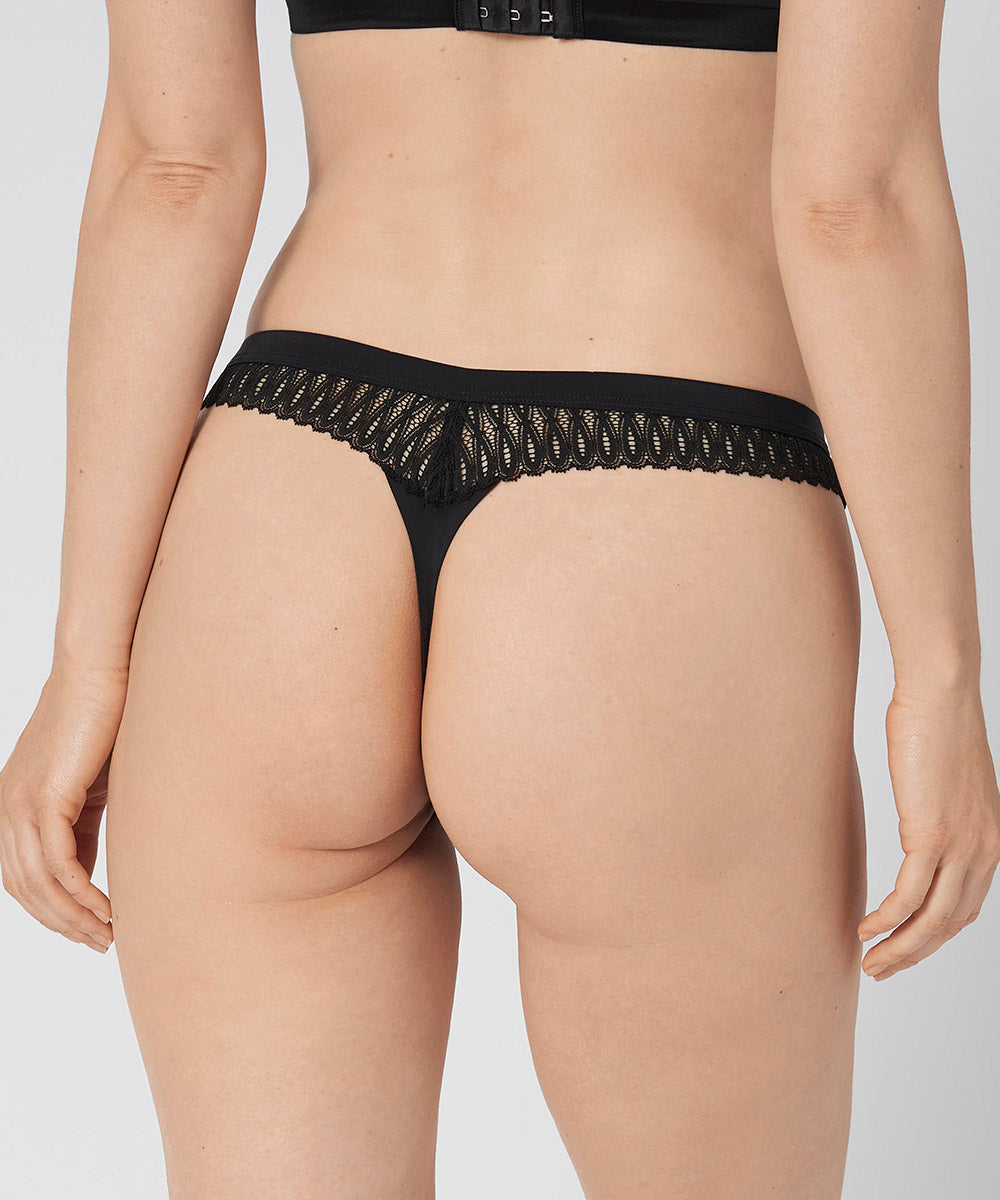 Fine stringtrusser med høje ben fra Triumphs Style Aura Spotlight-serie. Trusserne er hofteskårende med smalle sider med blonde-detaljer på siden. Trussen har flade kanter, så man ikke kan se den under tøjet. Trussen er lavet af mikrofiber for en behagelig pasform.
