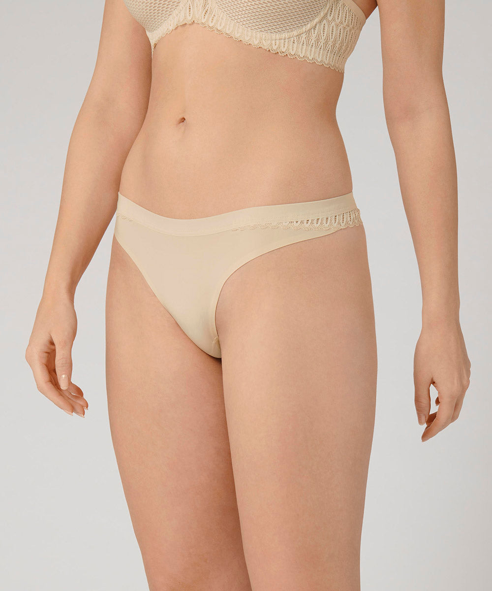 Fine stringtrusser med høje ben fra Triumphs Style Aura Spotlight-serie. Trusserne er hofteskårende med smalle sider med blonde-detaljer på siden. Trussen har flade kanter, så man ikke kan se den under tøjet. Trussen er lavet af mikrofiber for en behagelig pasform.