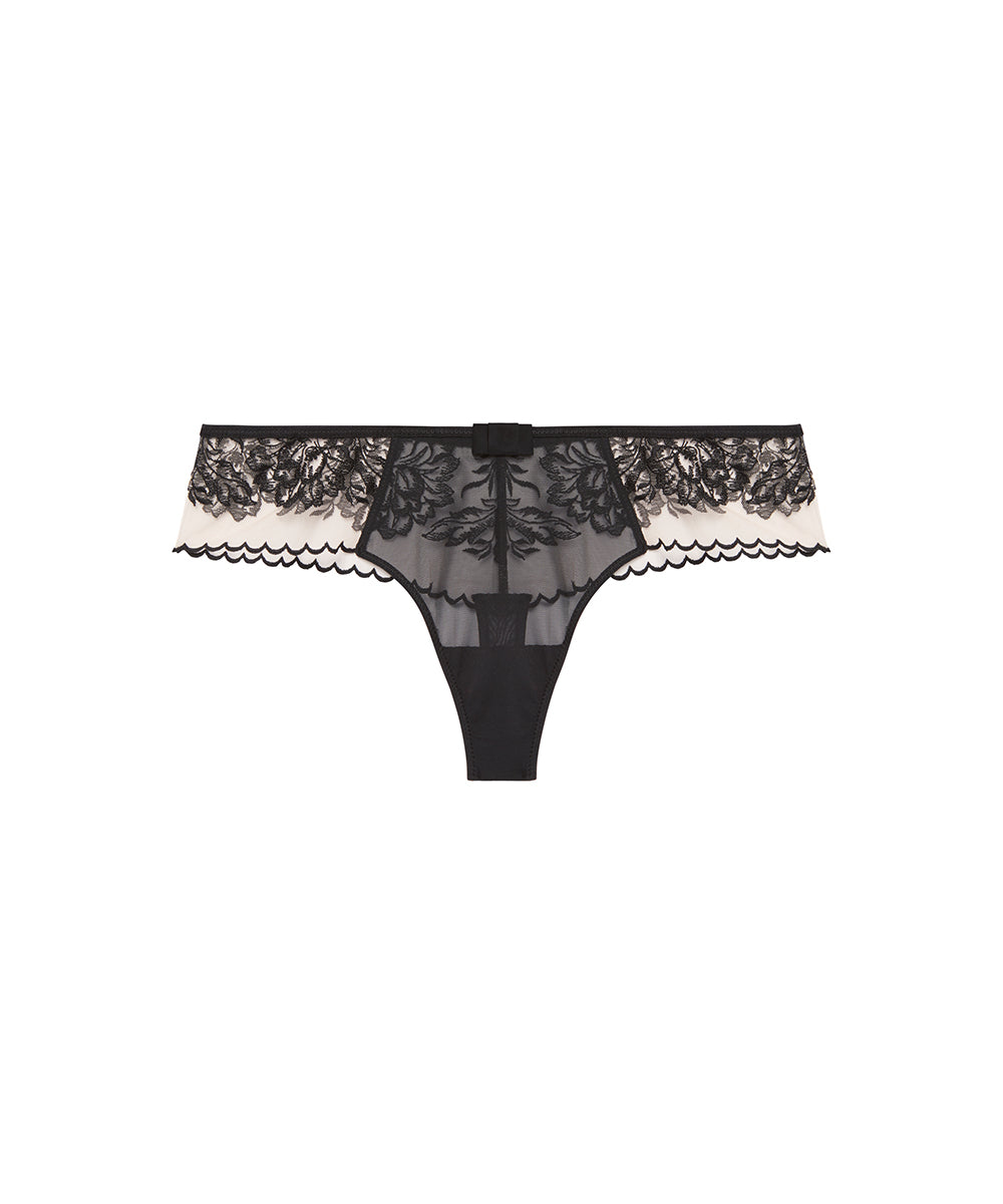 Flatterende tangatrusse fra Simone Pérèle med forførende blonder. Trussen er sømløs, hvilket gør den ideel under tætsiddende tøj. String og tangatrusser er særligt velegnede under tætsiddende bukser, kjoler og nederdele, da bagstykket - en tynd streng mellem balderne - ikke efterlade synlige overgange under tøjet. String og tangatrusserne har en høj benudskæring og får derfor dine ben til at syne optisk længere.