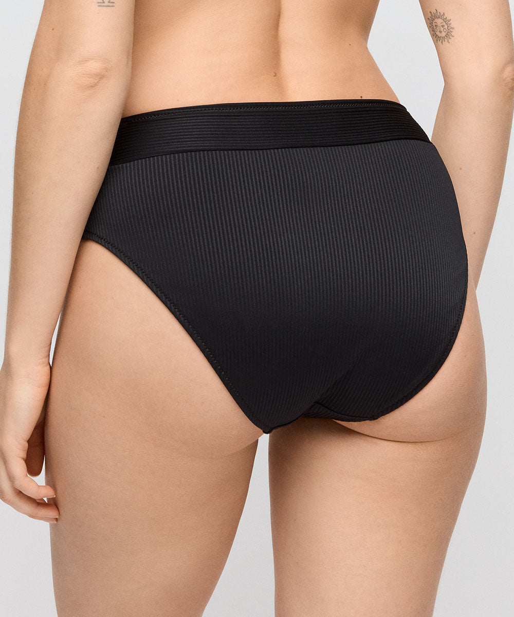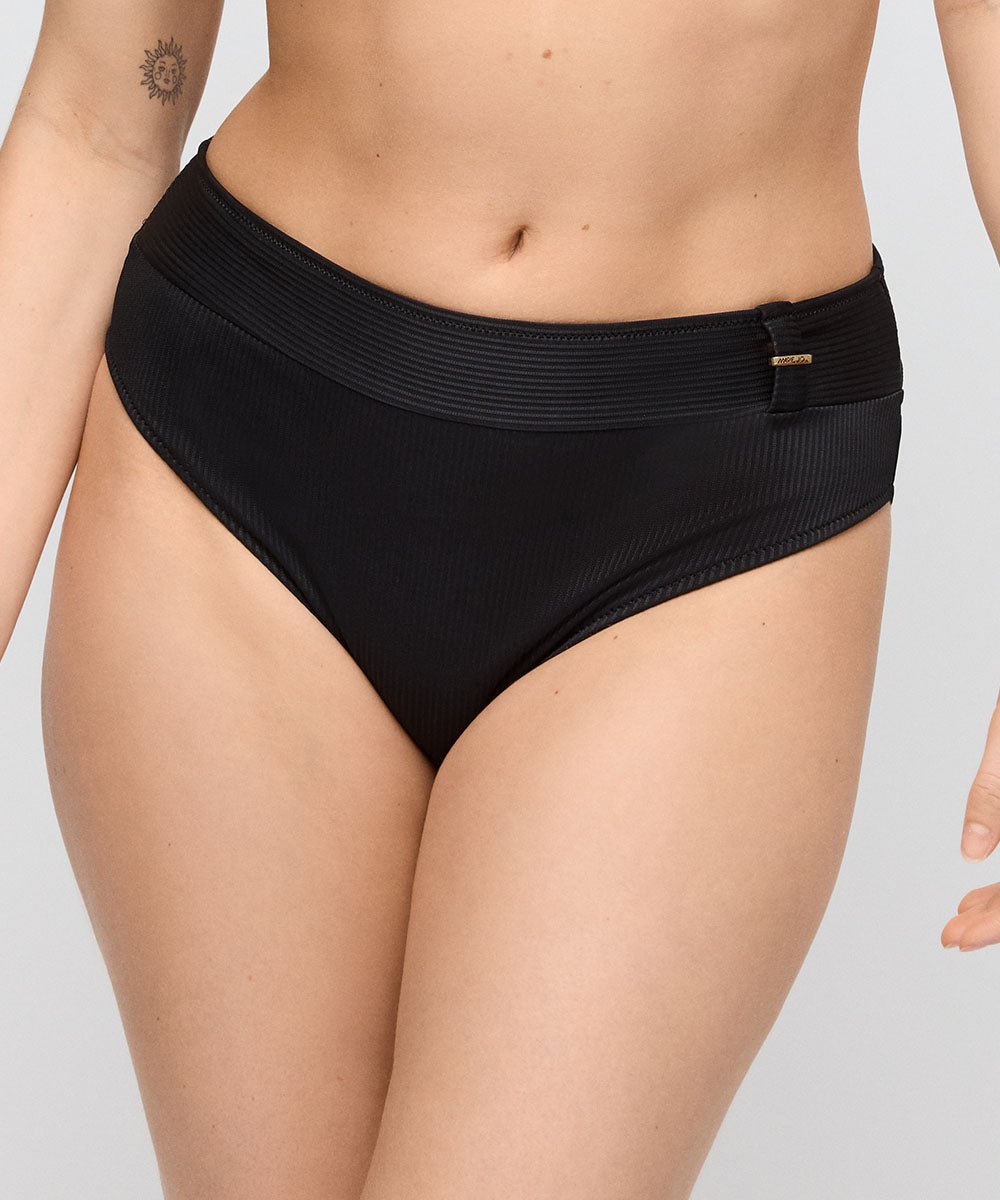 Elegant bikiniunderdel fra Marie Jo, som er lavet i en højtaljet og behagelig taimodel med lækre detaljer. Da bikinitrussen er højtaljet, fremhæver den taljen og tilfører lidt ekstra elegance til dit look. Badetøj skal gerne sidde stramt, da det udvider sig ved brug. Husk altid at skylle badetøjet op i koldt vand efter brug.