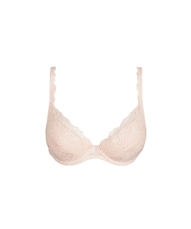 Feminin push-up bh fra Marie Jo. Bh'en er prydet med en smuk all-over blonde, der er lavet af bløde og genanvendte materialer. Mulighed for at justere push-up effekten med udtagelige puder. Bh'en løfter og centrerer barmen, der giver en flot, dyb dekolletage. En push-up bh samler og løfter barmen ved hjælp af indlæg/ fyld. Vælg push-up modellen, hvis du gerne vil fremhæve din barm og skabe en synlig kavalergang. De fleste push-up bh'er fås i trekvartskål med skrå udskæring og push halvt fra siden og halvt fra bunden.