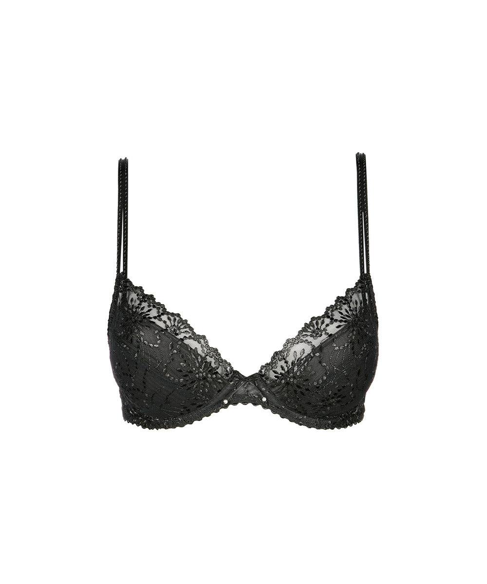 Feminin push-up bh designet i en fin blomstret blonde. Mulighed for at justere push-up effekten med udtagelige puder i A-, B- og C-skål. Bh'en løfter og centrerer barmen, der giver en flot, dyb dekolletage. En push-up bh samler og løfter barmen ved hjælp af indlæg/ fyld. Vælg push-up modellen, hvis du gerne vil fremhæve din barm og skabe en synlig kavalergang. De fleste push-up bh'er fås i trekvartskål med skrå udskæring og push halvt fra siden og halvt fra bunden.