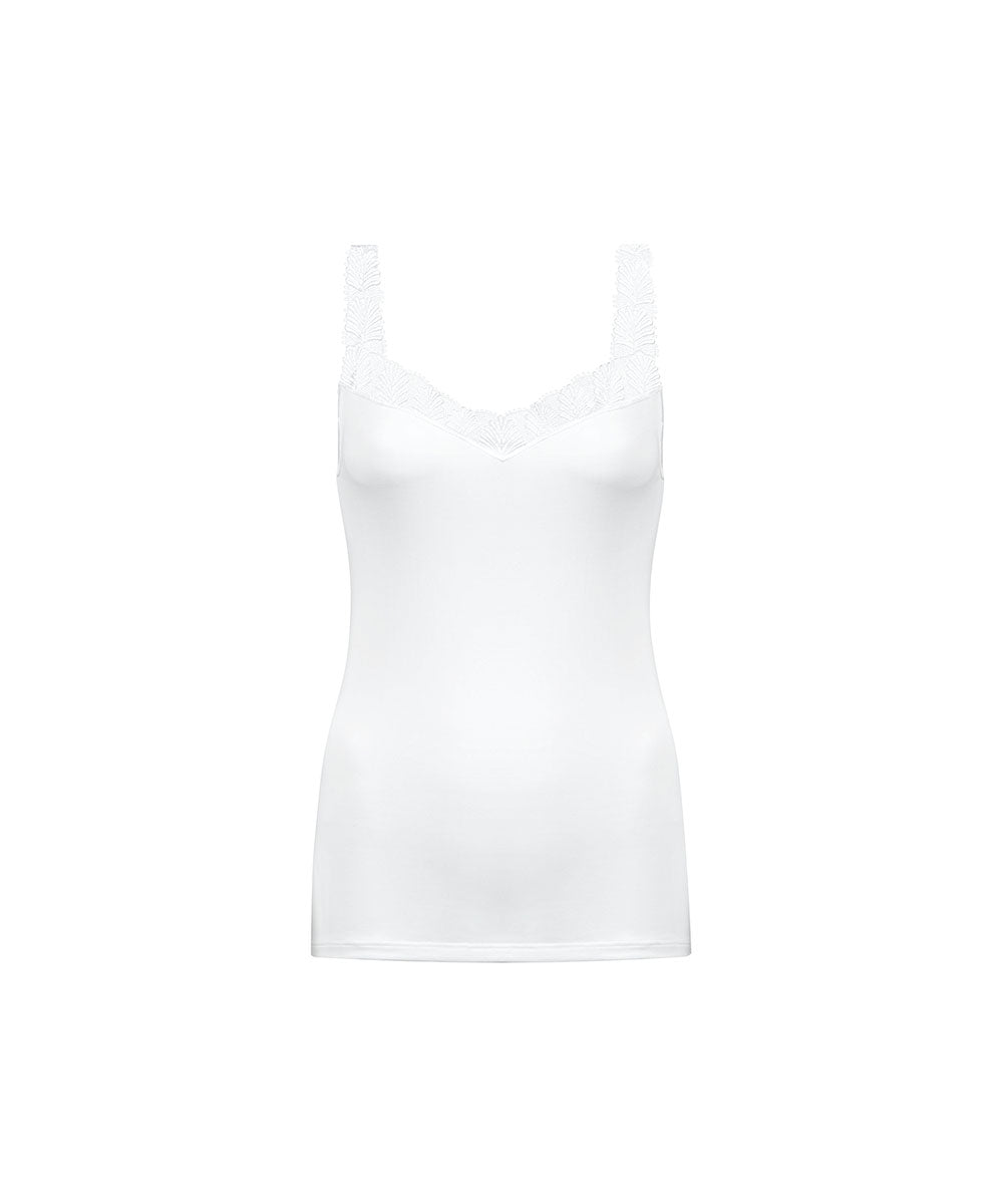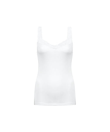 Blød top fra Mey med brede stropper, lavet i åndbare materialer. Toppen er prydet med yndige blonder i halsudskæringen som fortsætter op ad stropperne.