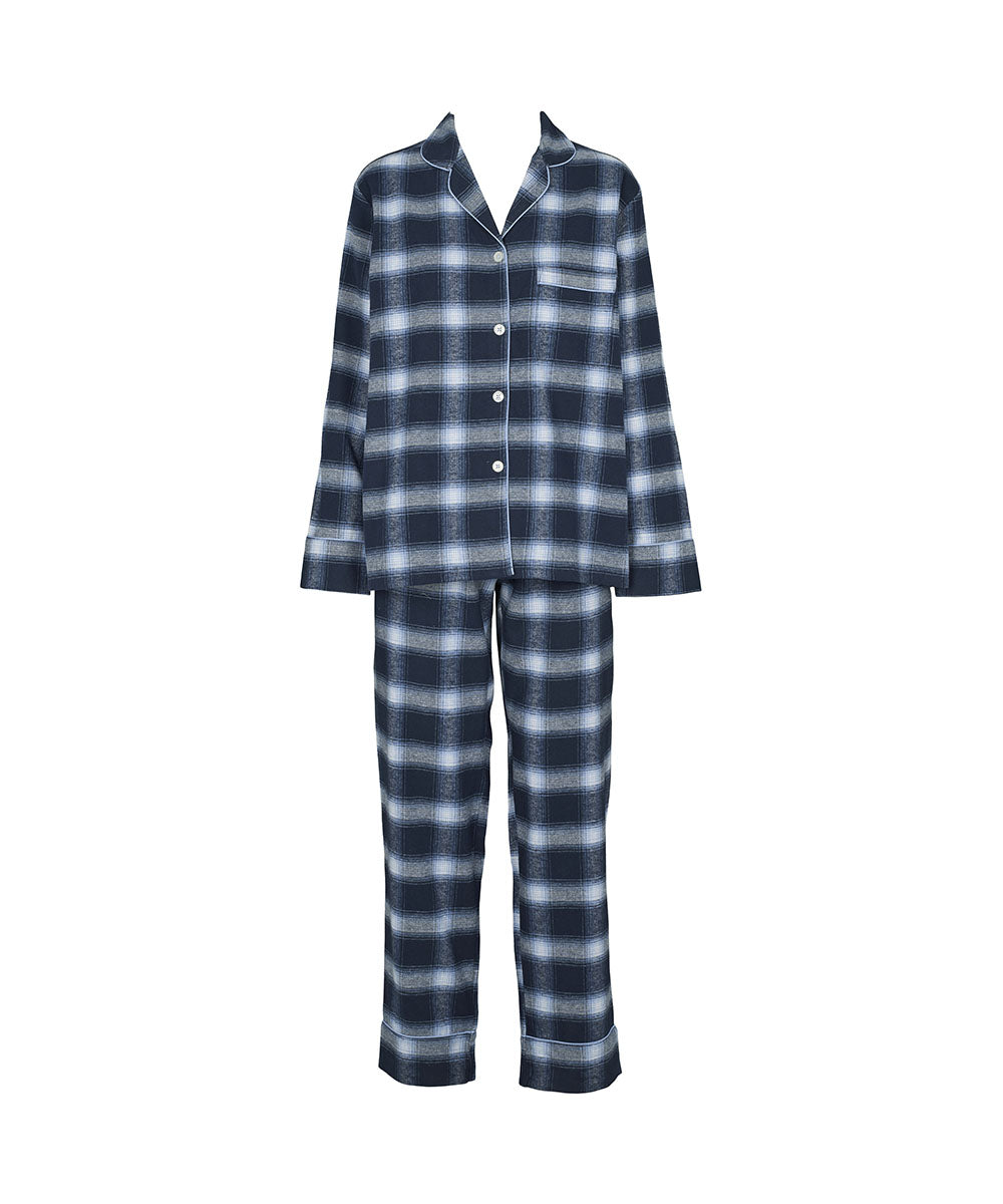Komfortabelt og yndigt pyjamassæt fra Missya med tern. Overdelen lukkes med gennemgående knapper og bukserne er designet i et lige snit.