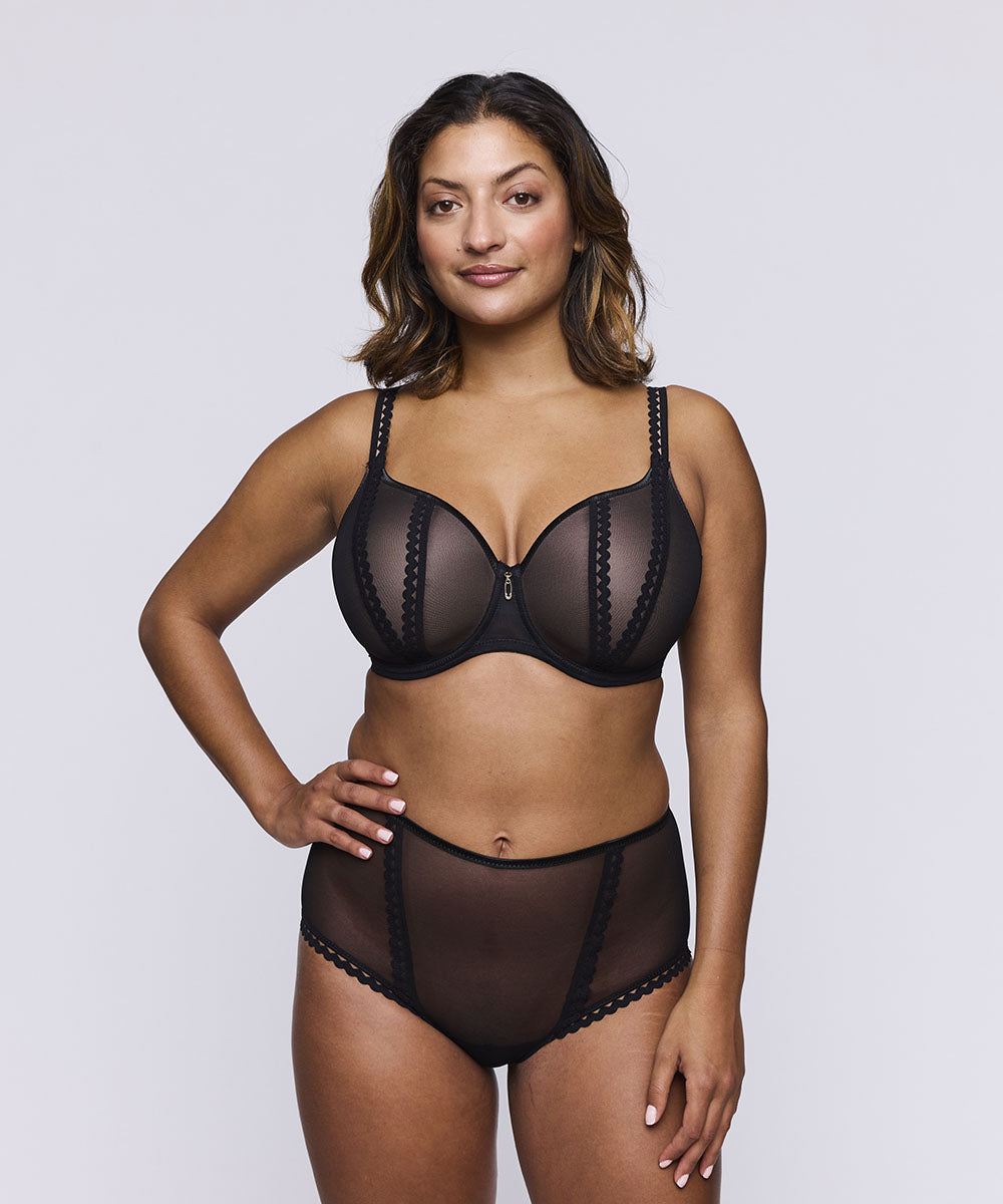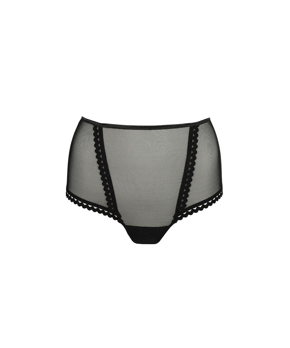 Højtaljet hipstertrusse fra PrimaDonna Twist. Trusserne er designet med striber i mesh og smukke blondeafslutninger. Trussemodellerne hipster og shorts har en vandret benudskæring. Hipstertrussen går lidt op på balden og tegner et vandret snit mens shortsene dækker hele balden.