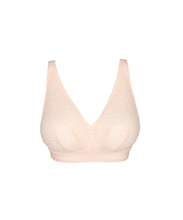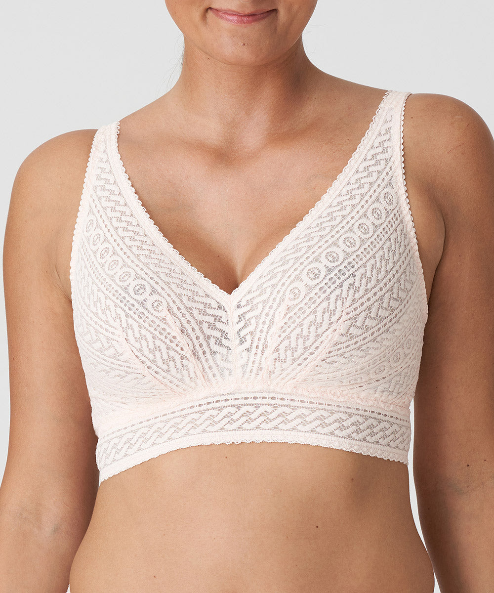 Forførende fuldskålsbh dekoreret med en feminin blonde fra PrimaDonna. Denne model løfter barmen og giver en flot og naturlig rund silhuet. Denne fuldskålsbh er designet uden bøjle, og minder derfor om en trekantet bralette. Braletten er designet med en bred omkredser, der holder og løfter barmen, og justerbare stropper. Denne bh er til dig der ønsker en fuldskålsbh uden bøjle.