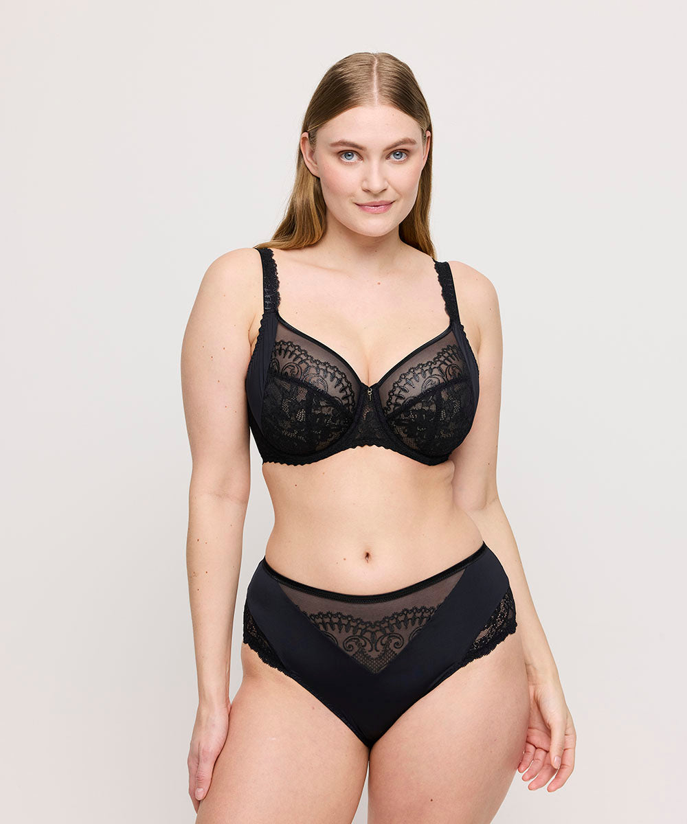 Forførende fuldskålsbh fra PrimaDonna. Bh'en er tilpasset den fyldige barm for at give maksimal support og støtte. Fuldskålen er konstrueret af 3 dele, som løfter, samler og støtter barmen. Sidestykkerne er designet bredere for bedre support til barmen. Denne form dækker hele barmen samt giver en diskret kavalergang. BH'en er ideel til kvinder med en dyb og fyldig barm. Designet med smukke meshdetaljer. Med U-formet ballet back giver denne model optimal support. Ballet back karakteriseres ved stroppernes placering på bagstykket, som danner en U-form. U-formen omslutter kroppen tættere for bedre support og støtte samt fastholder stroppernes placering på skuldrene.