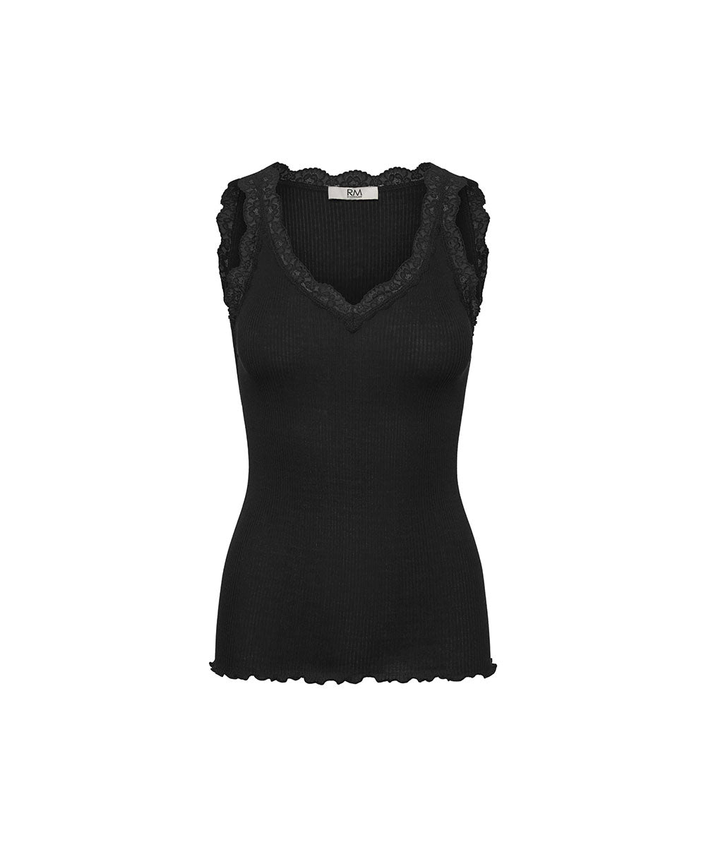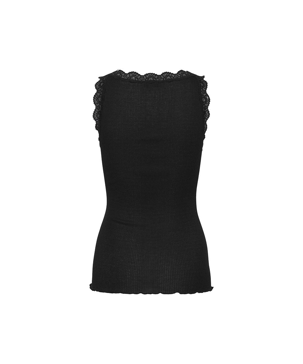 Elegant undertrøje fra Rosemunde. Undertrøjen er dekoreret med smukke blonder langs halsudskæringen. Toppen er rundstrikket i en blød ribbet, der indeholder både bomuld og modal. Tøj lavet i modal er fordelagtig at have, hvis du ønsker åndbart og hurtigtørrende tøj. Dertil kan modal have en kølende effekt, og samtidig er det meget vandabsorberende – hvilket kan være til gavn for dig, hvis du har tildens til at svede.