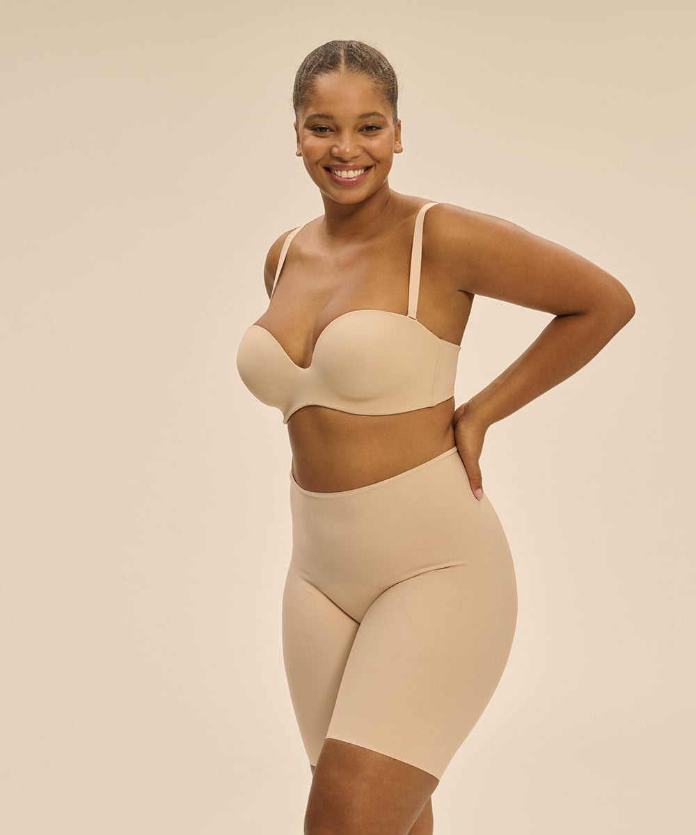 Simone Pérèles shapewear er indbegrebet af elegance og komfort. Shapewear shortsne er designet med sømløse benskæringer, der gør denne shortstrusse perfekt under kropsnært tøj. Højtaljet shapewear med ben, der giver shape-effekt og former talje, mave og lår. Det er vigtigt ikke at vælge en størrelse for stor, da shape-effekten ellers vil gå tabt, og silikonebåndet i taljen ikke vil have mulighed for at holde trussen på plads.