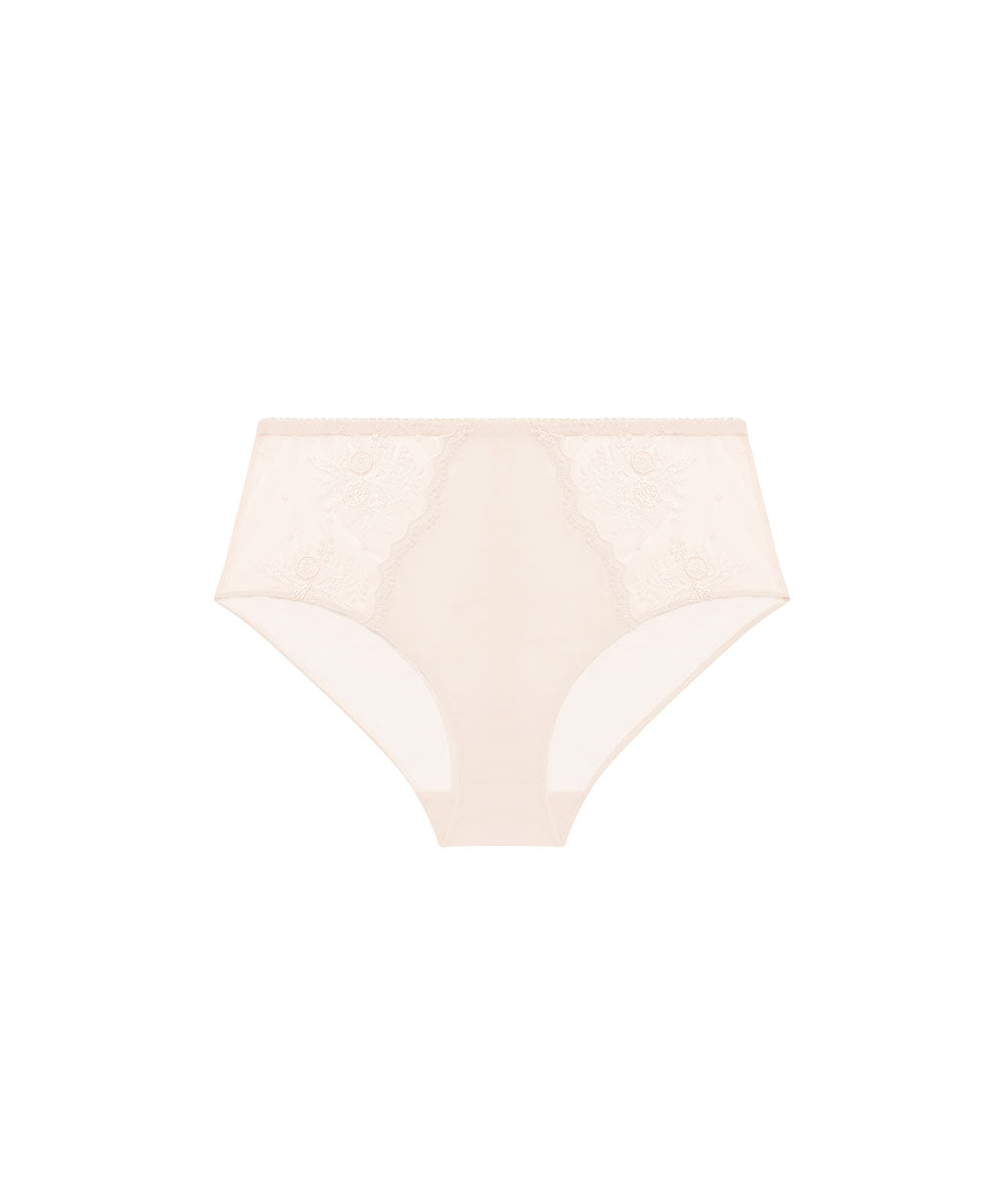 Smuk maxitrusse fra Simone Pérèle. Simone Pérèle har designet en elegant højtaljet trusse i en yndig og flad blonde, der pryder sidestykkerne. Maxitrussen er en højtaljet trusse med bredt sidestykke og lavt bensnit. Maxitrussen dækker den nederste del af maven og passer derfor godt til tøj, der går op i taljen. Materiale: 65 % polyamid, 22 % polyester, 8 % bomuld, 5 % elastan