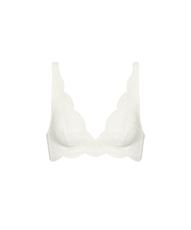Denne blonde trekantsbh fra Simone Pérèle giver en naturlig barm. Bh'en har justerbare stropper, som kan bæres klassisk eller crossover. Trekantstoppen er designet uden bøjle og er uden vatterede skåle. Trekantsbh'er er er skåret skråt og tegner dermed et v-snit for til på barmen. Fordi trekantsbh'en løber skråt over barmen, kan modellen være god til kvinder med mindre fylde øverst på barmen - den skrå linje lukker skålen for oven, så den ikke så let gaber. Mange trekantsbh'er er uden bøjle og derfor særlig anvendelige til dig, der helst er fri for traditionelle bøjler.