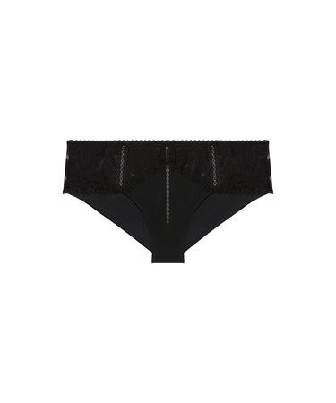 Hipstertrussen er designet med brede sidestykker og en høj vandret skæring bagpå. Trussen er designet med et elastik-fri, dobbeltlag tyl på bagstykket, der gør trussen mere behagelig og diskret under tøj. Linningen hviler på hofterne uden at give mærker. Frontstykket er forstærket med et lag tyl prydet med yndig blonde. Denne trusse er ideel, hvis man ønsker en dækkende trusse uden trussekanter. Materiale: 64% polyamid, 29% elastan, 7% bomuld.