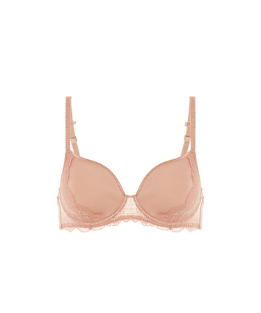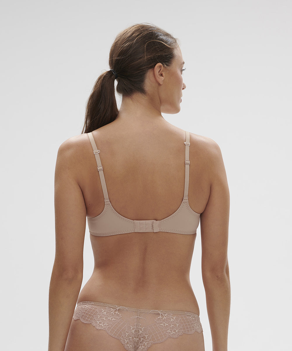 Reve serien sætter en ny standard for elegance ved at kombinere Leavers blonde med smuk guipure broderi. Simone Pérèles innovative 3D spacer er unik, da det forsvinder og bliver til "second skin" på kroppen. Materialet er utroligt blødt og samtidigt åndbart, hvilket gør det helt ideelt til lingeri. I Reve's trekvartskålsbh får du et smukt hjerteformet snit, der samler barmen i en elegant dekolletage. Bh'en er lavet i en ganske tynd vattering, der definerer barmen naturligt uden at tilføje ekstra volumen til barmen. Fantastiske og luksuriøse blondedetaljer på både skåle og omkreds, og ikke mindst en smuk, rundende pasform. Med U-formet ballet back giver denne model optimal support. Ballet back karakteriseres ved stroppernes placering på bagstykket, som danner en U-form. U-formen omslutter kroppen tættere, for bedre support og støtte samt fastholder stroppernes placering på skuldrene. Bredden på stropper og bagstykke bliver bredere i takt med højere skålstørrelse, for at imødekomme en fyldigere barm. Materiale: 53% polyester, 30% polyamid, 17% elastan.
