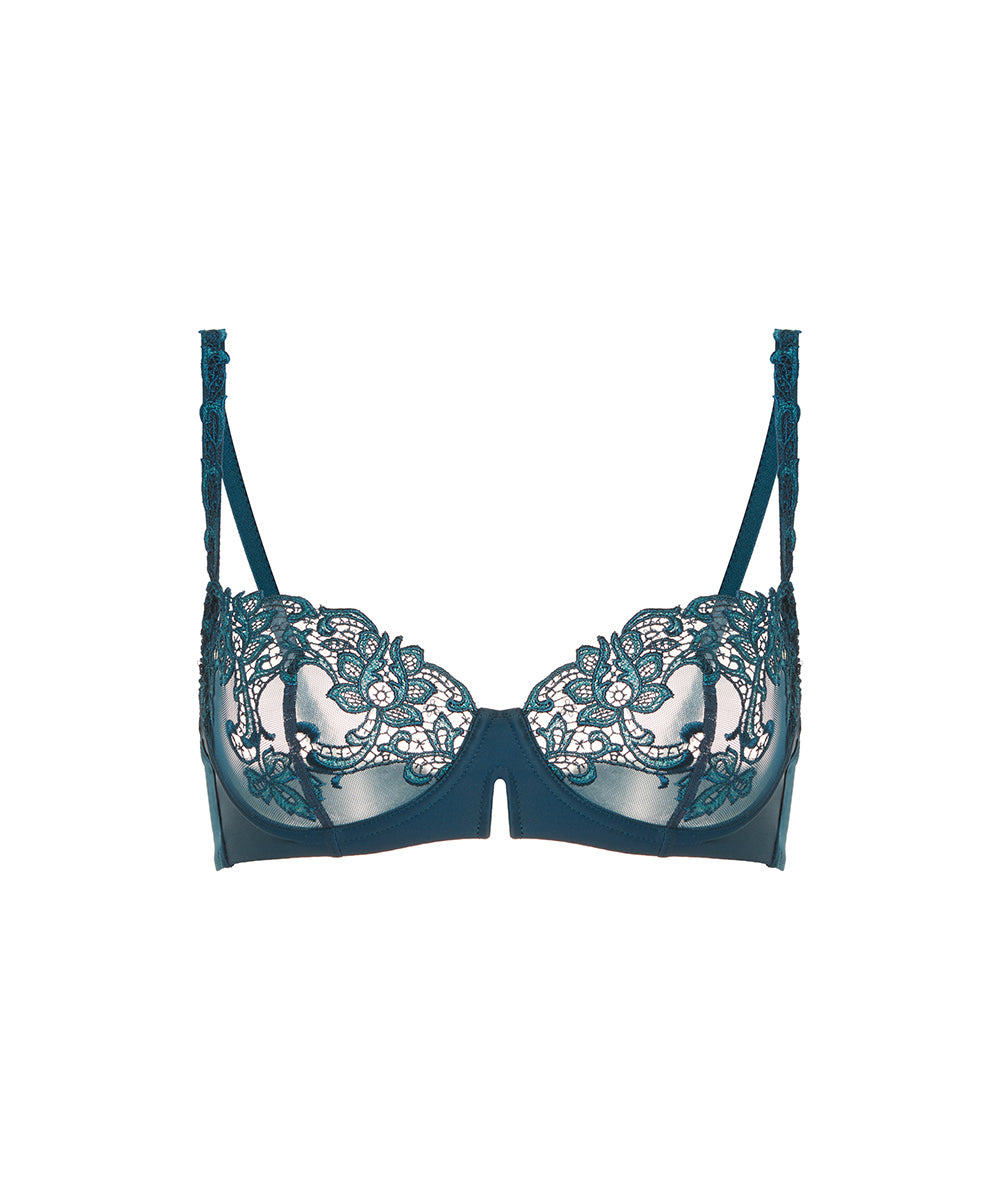 Halvskålsbh'en er karakteriseret ved den vandrette skæring over barmen samt den lodrette søm på skålen. Denne model løfter barmen, og giver et flot og naturligt rundt udtryk samt en åben og feminin kavalergang. Denne halvskål er lavet i de fineste blomster broderier, hvor hver detalje bliver omhyggeligt bearbejdet. Bredden på stropperne samt bagstykket bliver bredere i takt med højere skålstørrelse, for at imødekomme fyldigere barm. Materiale: 56% polyamid, 36% polyester, 8% elastan.