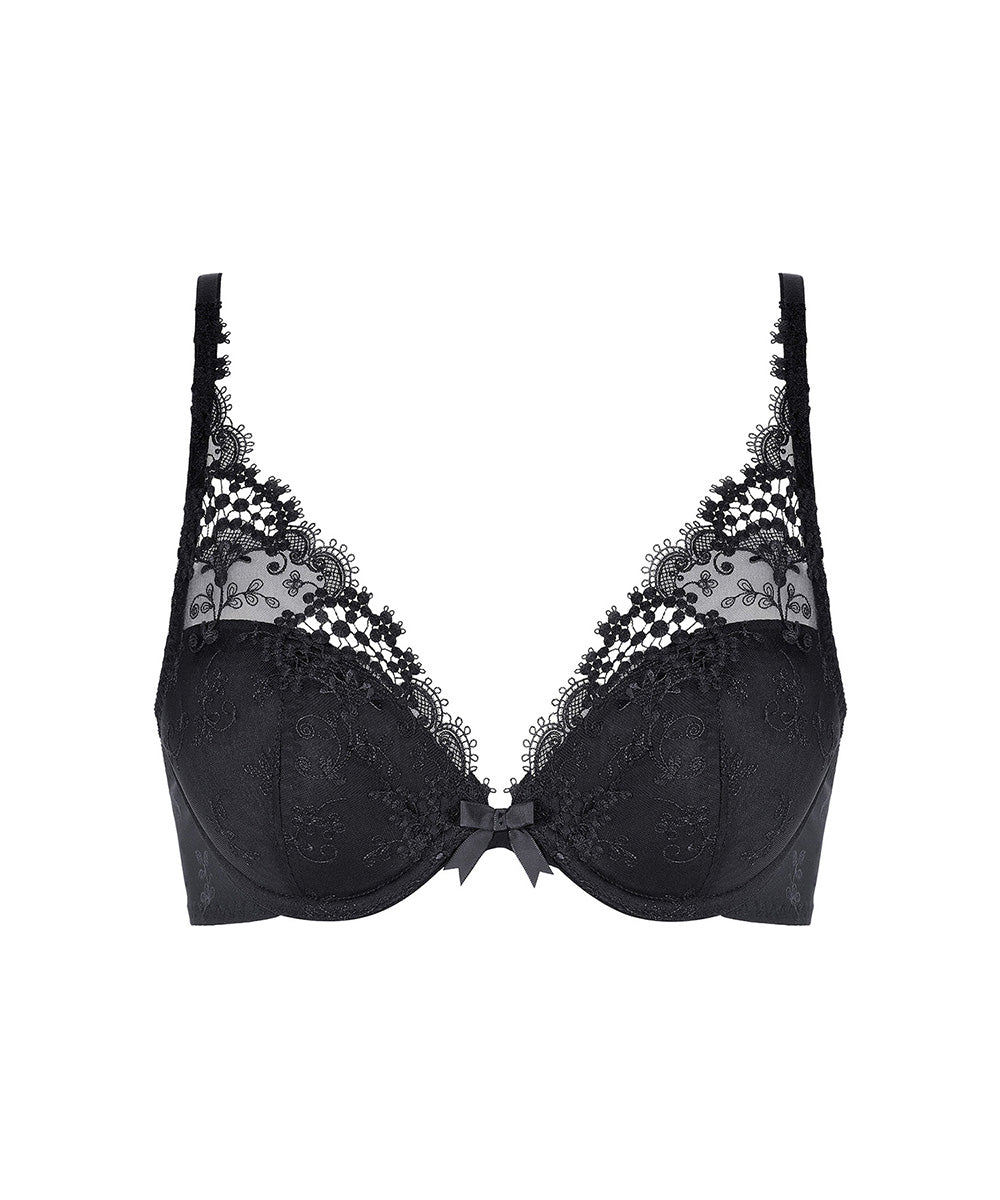 Trekantet push-up bh, der centrerer, samler og løfter barmen. Push-up effekten kan nedtones med udtagelige puder. Bh'en er dekoreret i de fineste guipure broderier, hvor hvert enkelt broderi bliver omhyggeligt bearbejdet. Bh'en er ideel under lavt skåret bluser og kjoler.
