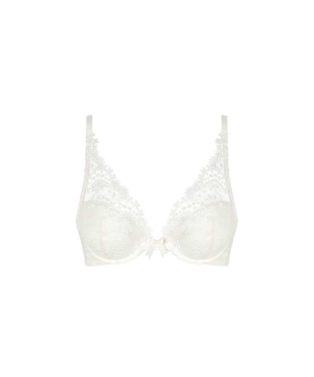 Trekantet push-up bh, der centrerer, samler og løfter barmen. Push-up effekten kan nedtones med udtagelige puder. Bh'en er dekoreret i de fineste guipure broderier, hvor hvert enkelt broderi bliver omhyggeligt bearbejdet. Bh'en er ideel under lavt skåret bluser og kjoler. Materiale: 76% polyester, 12% polyamid, 11% polyurethan, 1% elastan.