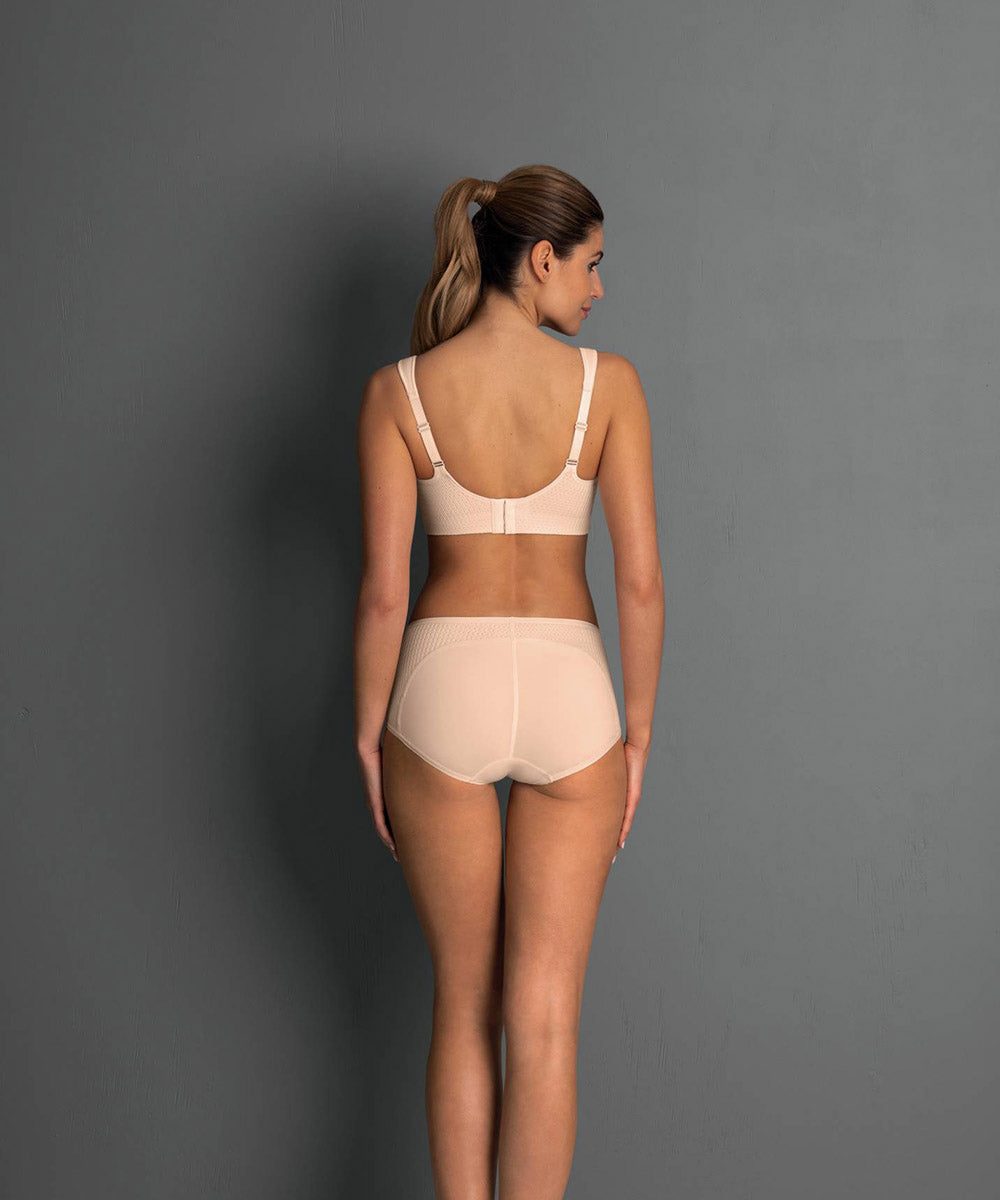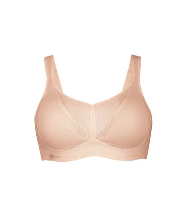 Maximum sportsbh fra Anita har special udviklede trekantede og formstøbte skåle, der giver optimal støtte også i større skåle. Skålene er lavet af et special patenteret, dobbelt skumlag, der sammen med ultralet mesh og åbne sektioner i sidestykker samt under skålene gør bh'en meget åndbar og svedtransporterende. Komfort stropperne er ergonomisk udformede, der ligger fast på skuldrene og forhindrer dem i at glide ned. Stropperne bliver brede i takt med større skålstørrelse. Bh'en er nikkelfri og øko-tex certificeret.