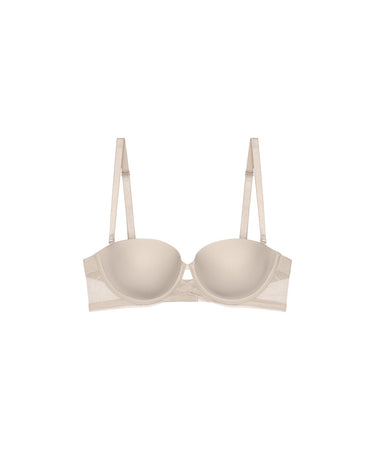 Stropløs bh fra Triumph. Bh'en har en let vatttering, der giver barmen en fin runding. Bh'en kan også benyttes med stropper som en almindelig balconettebh. Halvskålsbh'er kaldes ofte balconetter. Balconette bh'er har et vandret snit på skålene og dækker halvdelen af barmen. Stropperne er placeret yderst ude på skuldrene, og balconettebh'en er derfor perfekt til toppe med dybe/ vide udskæringer. Har du fylde øverst på barmen, kan du både bruge de rene blondebalconetter og de vatterede modeller.