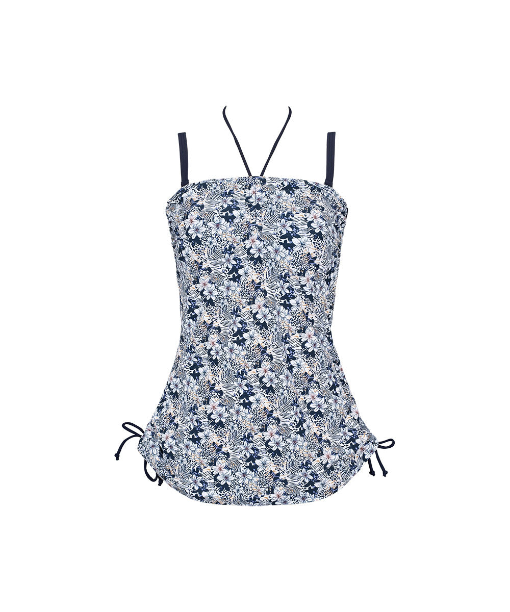 Fin tankini i blomster print fra Missya. Tankinien har vatteret skåle og uden bøjle. Badetøj skal gerne sidde stramt, da det udvider sig ved brug. Husk altid at skylle badetøjet op i koldt vand efter brug.