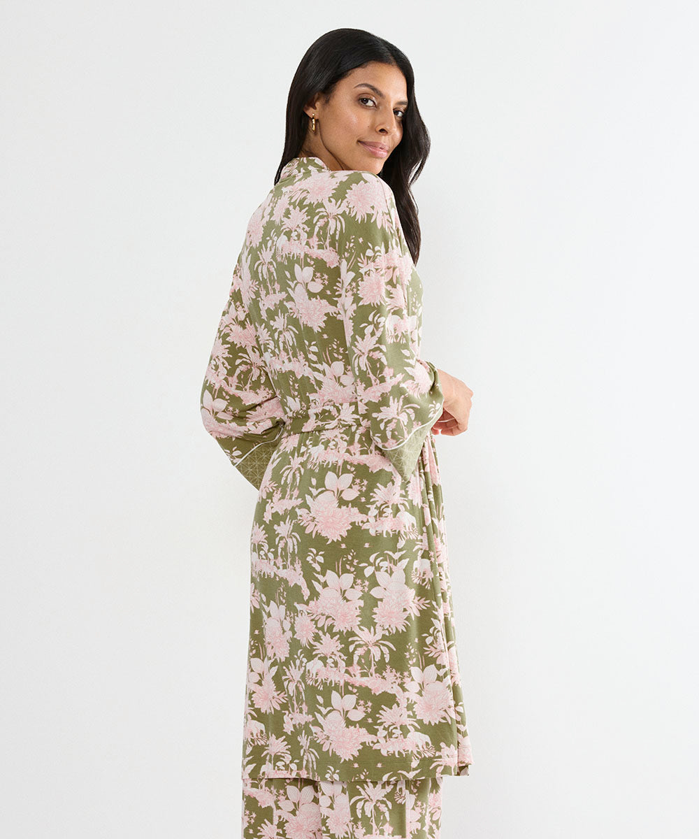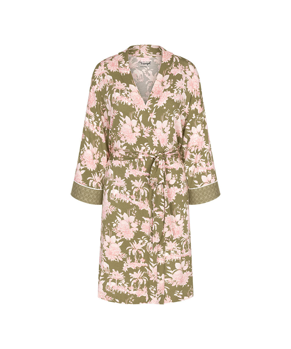 Smuk morgenkåbe fra Triumph i blød modal, Materialet føles let og behageligt mod huden og falder smukt langs kroppen. Modellen har en længde til lige over knæet og bindebælte i taljen, som giver en feminin og flatterende silhuet. Brug kåben sammen med de matchende bukser eller udover dit yndlings sæt lingeri.