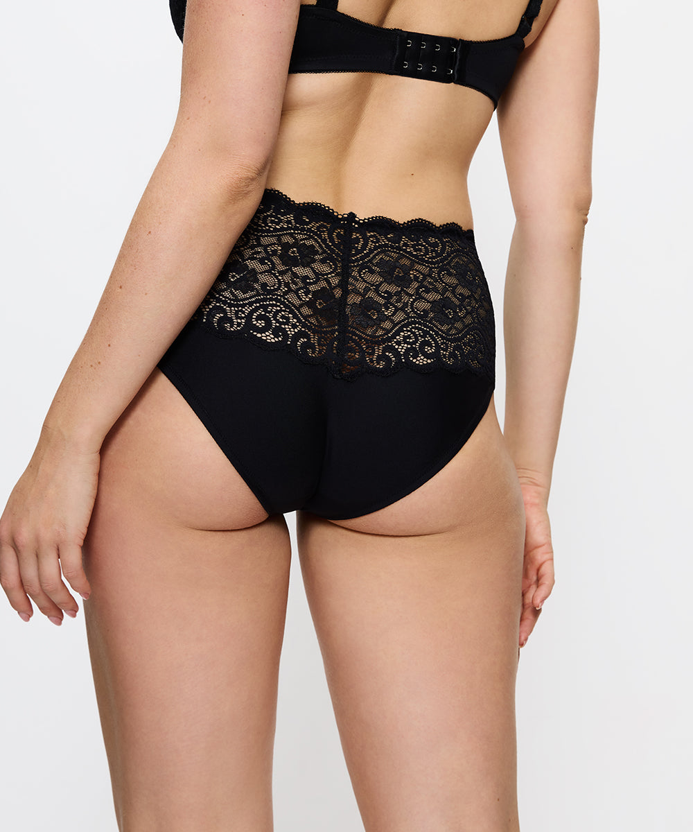 Komfortabel, blød og høj taitrusse fra Triumph i blødt og glat microfiber materiale. Trussen er designet i en fin all-over blonde med forstærket frontstykke. Trussekanten er afsluttet med en feminin picotkant. Maxitrussen er en højtaljet trusse med bredt sidestykke og lavt bensnit. Maxitrussen dækker den nederste del af maven og passer derfor godt til tøj, der går op i taljen.