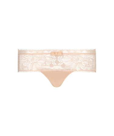 Elegant hipstertrusse fra Chantelle med fine, dekorative blondedetaljer og tyl og feminin sløjfe i midten. Hele bagstykker er lavet i tyl for let komfort. Trussemodellerne hipster og shorts har en vandret benudskæring. Hipstertrussen går lidt op på balden og tegner et vandret snit mens shortsene dækker hele balden.