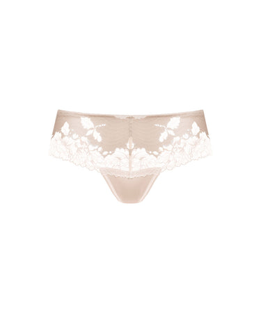Hipstertrusse designet i en all-over blomsterblonde fra Mey. Trussemodellerne hipster og shorts har en vandret benudskæring. Hipstertrussen går lidt op på balden og tegner et vandret snit mens shortsene dækker hele balden.