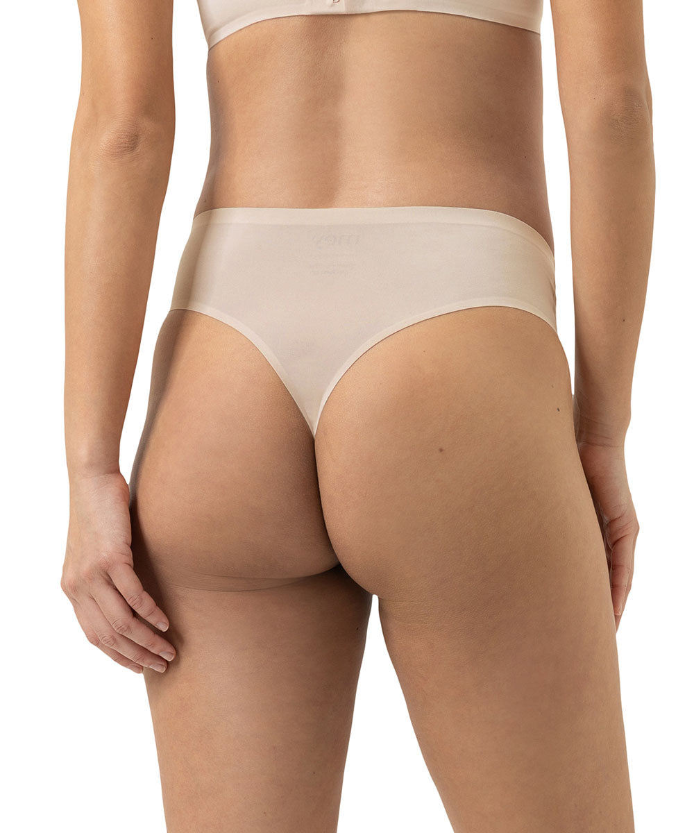 Sømløs trusse fra Mey. Trussernes specielle kombination af materialer sikrer maksimal elasticitet og enestående komfort, hvilket gør disse trusser ideelle til alle lejligheder. String og tangatrusser er særligt velegnede under tætsiddende bukser, kjoler og nederdele, da bagstykket - en tynd streng mellem balderne - ikke efterlade synlige overgange under tøjet. Sting og tangatrusserne har en høj benudskæring og får derfor dine ben til at syne optisk længere.