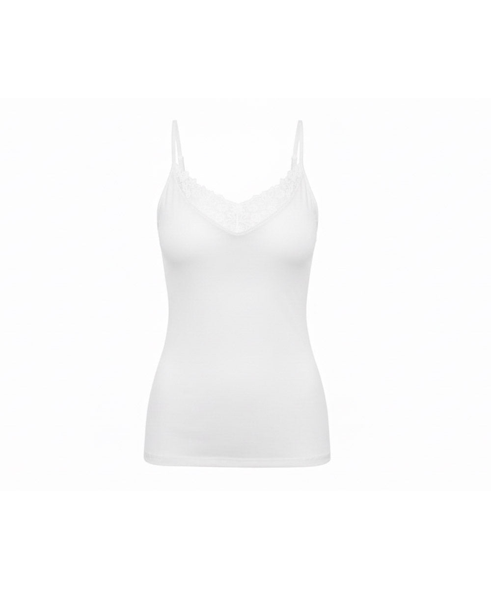Yndig basis top fra Calida med blonder og justerbare spaghettistropper. Toppen er lavet i fin, elastisk bomuldsjersey. Vær obs på størrelsesguide.