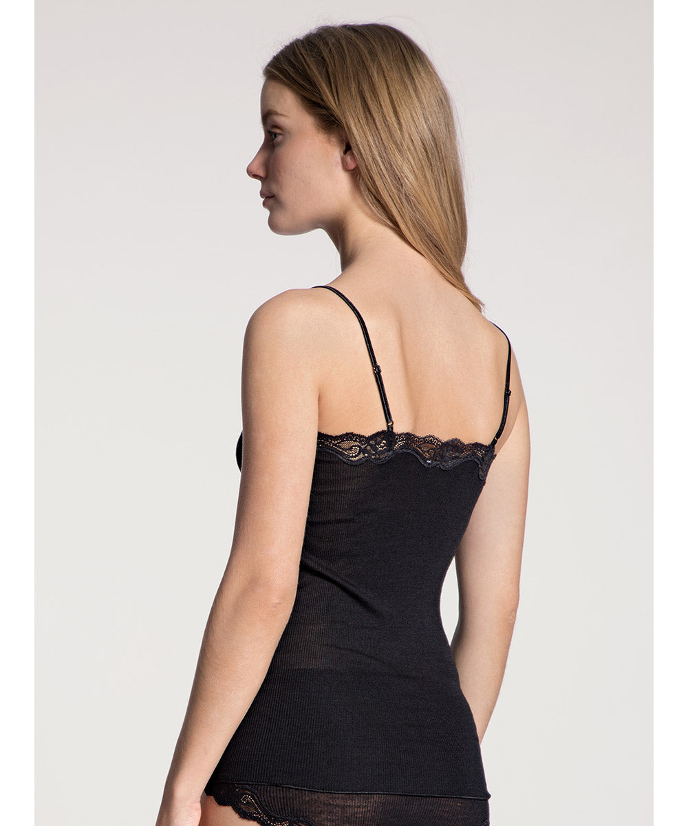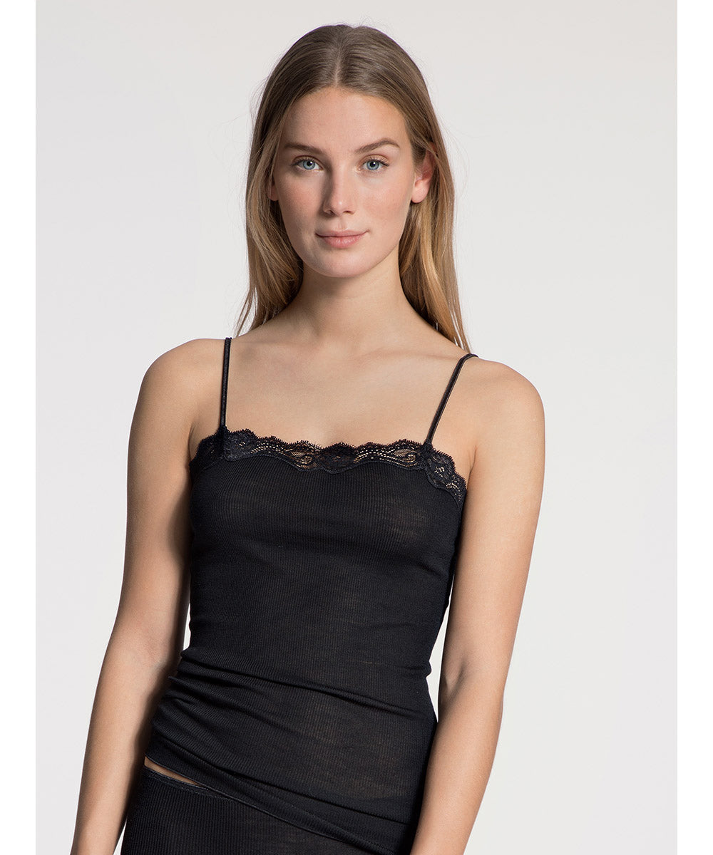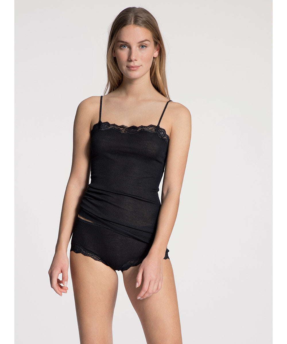 Enkel top fra Calida med justerbare spaghettistropper og blondekant. Toppen er lavet af en fin uld- og silkekvalitet. Kvaliteten giver en blød fornemmelse mod huden, varmer og holder fugt væk fra kroppen. Vær obs. på størrelsesguide.