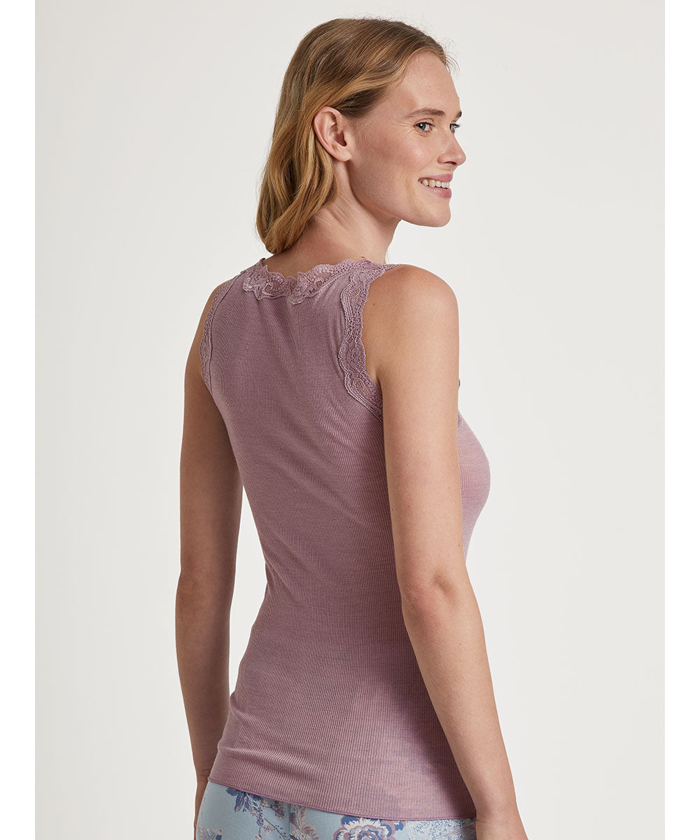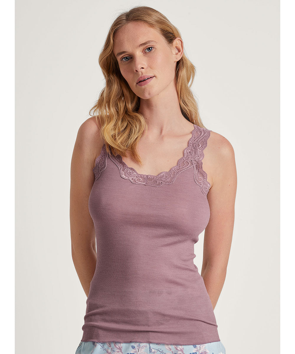 Silkeblød top fra Calida som er dekoreret med en fin blonde. Toppen er lavet af en fin uld- og silkekvalitet. Kvaliteten giver en blød fornemmelse mod huden, varmer og holder fugt væk fra kroppen. Vær obs. på størrelsesguide.